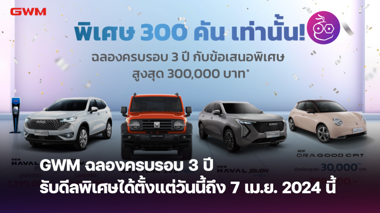 เกรท วอลล์ มอเตอร์ ประเทศไทย ฉลองครบรอบ 3 ปี พร้อมอัดโปรโมชันสุดคุ้มให้กับรถยนต์ทุกรุ่นแบบจัดเต็ม มอบข้อเสนอสุดพิเศษ ส่วนลดมูลค่าสูงสุด 300,000 บาท และจำนวนจำกัดเพียงแค่ 300 คันเท่านั้น รับข้อเสนอพิเศษได้ตั้งแต่วันนี้ ถึง วันที่ 7 เมษายน 2567 และต้องรับรถยนต์ภายในวันที่ 30 เมษายน 2567