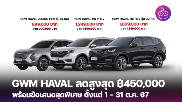 เริ่มต้นนำขบวนความคุ้มกับ All New GWM HAVAL H6 Plug-in Hybrid SUV มาพร้อมกับข้อเสนอพิเศษมูลค่าสูงสุด 510,000 บาท โดยลูกค้าสามารถเลือกโปรได้ตามใจกับส่วนลดมูลค่าสูงสุด 300,000 บาทเมื่อชำระด้วยเงินสด หรือ ดอกเบี้ย 0% พร้อมช่วยผ่อนมูลค่า 140,000 บาท ผ่อนนาน 72 เดือน เมื่อดาวน์ 25% มูลค่าสูงสุดไม่เกิน 220,000 บาท พร้อมรับฟรี GWM โฮมชาร์จเจอร์พร้อมติดตั้งในระยะสายไฟยาวไม่เกิน 15 เมตร 1 ครั้ง มูลค่าสูงสุดไม่เกิน 60,000 บาท และฟรีค่าอะไหล่และค่าแรงบำรุงรักษาตามระยะทาง สูงสุดไม่เกิน 10 ครั้ง ภายในระยะเวลา 5 ปี หรือระยะทาง 100,000 กิโลเมตร รวมมูลค่า 37,000 บาท