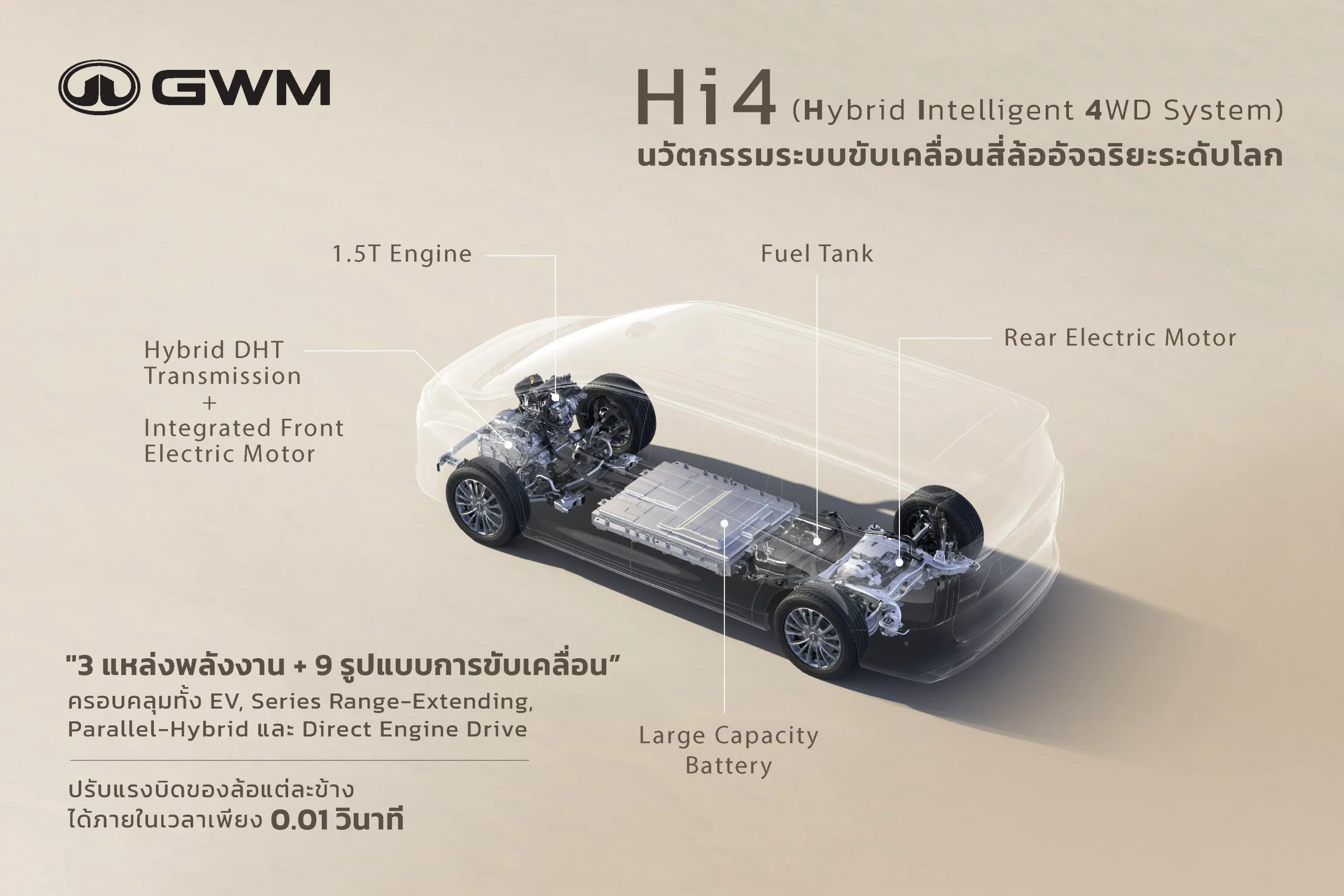 เทคโนโลยี Hi4 ได้ก้าวสู่ความสำเร็จครั้งประวัติศาสตร์ของอุตสาหกรรมยานยนต์โลก ด้วยการปฏิวัติระบบขับเคลื่อนสี่ล้อไฮบริดอัจฉริยะ ผ่านสถาปัตยกรรมล้ำสมัย “3 แหล่งพลังงาน + 9 รูปแบบการขับเคลื่อน ผสานการควบคุมอัจฉริยะ iTVC (Intelligent Torque Vectoring Control) เพื่อมอบประสบการณ์ขับขี่ที่เหนือระดับ ทั้งรวดเร็ว นุ่มนวล เงียบ ประหยัด และปลอดภัย พร้อมรองรับทุกสภาพการใช้งานทั่วโลกอย่างเต็มประสิทธิภาพ โดยหัวใจสำคัญของความสำเร็จนี้คือการพัฒนาระบบขับเคลื่อนสี่ล้อแบบ Series-Parallel ด้วยมอเตอร์คู่และเกียร์หลายระดับ ซึ่งนับเป็นครั้งแรกของโลกที่พลิกข้อจำกัดเดิมที่ทำได้เพียงการขับเคลื่อนสองล้อ ทำให้ระบบสามารถทำงานในโหมดขับเคลื่อนสี่ล้ออย่างเต็มรูปแบบได้จริง ซึ่งสามารถนำไปพัฒนาใช้ได้กับรถหลากหลายประเภท และทำให้วิสัยทัศน์ “การขับเคลื่อนสี่ล้อสำหรับทุกคน” ของ GWM เกิดขึ้นจริงอย่างเป็นรูปธรรม นอกจากนี้ เทคโนโลยี Hi4 ยังยกระดับมาตรฐานความปลอดภัยของแบตเตอรี่และเทคโนโลยีขับขี่อัจฉริยะ พร้อมขับเคลื่อนอุตสาหกรรมยานยนต์สู่ยุคใหม่ด้วยมาตรฐานความปลอดภัยและสมรรถนะขั้นสูงสุด