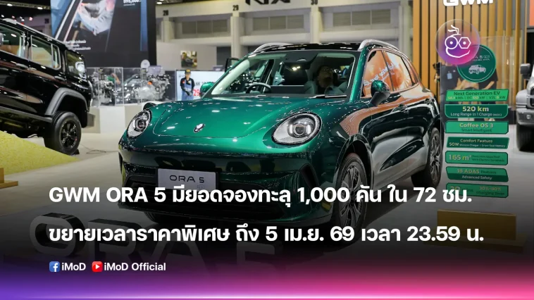 GWM ORA 5 มียอดจองทะลุ 1,000 คัน ภายใน 72 ชม. ประกาศขยายเวลาของราคาสุดพิเศษ จนจบงานมอเตอร์โชว์ฯ พร้อมเตรียมเพิ่มกำลังการผลิตที่โรงงานจังหวัดระยอง