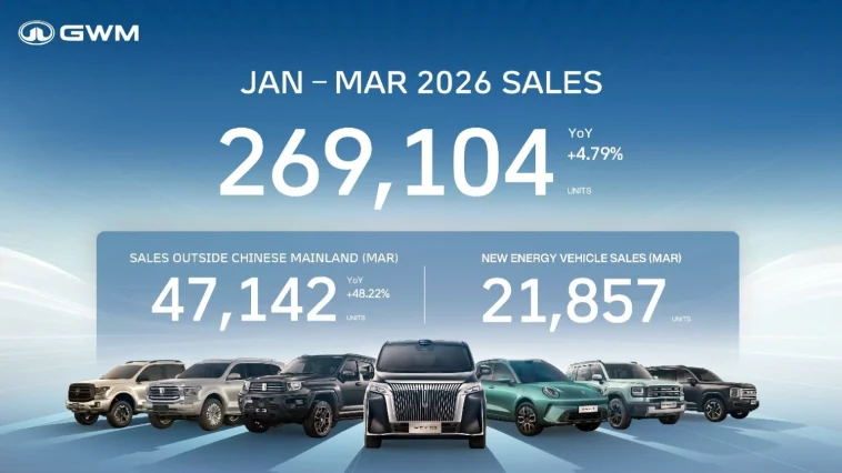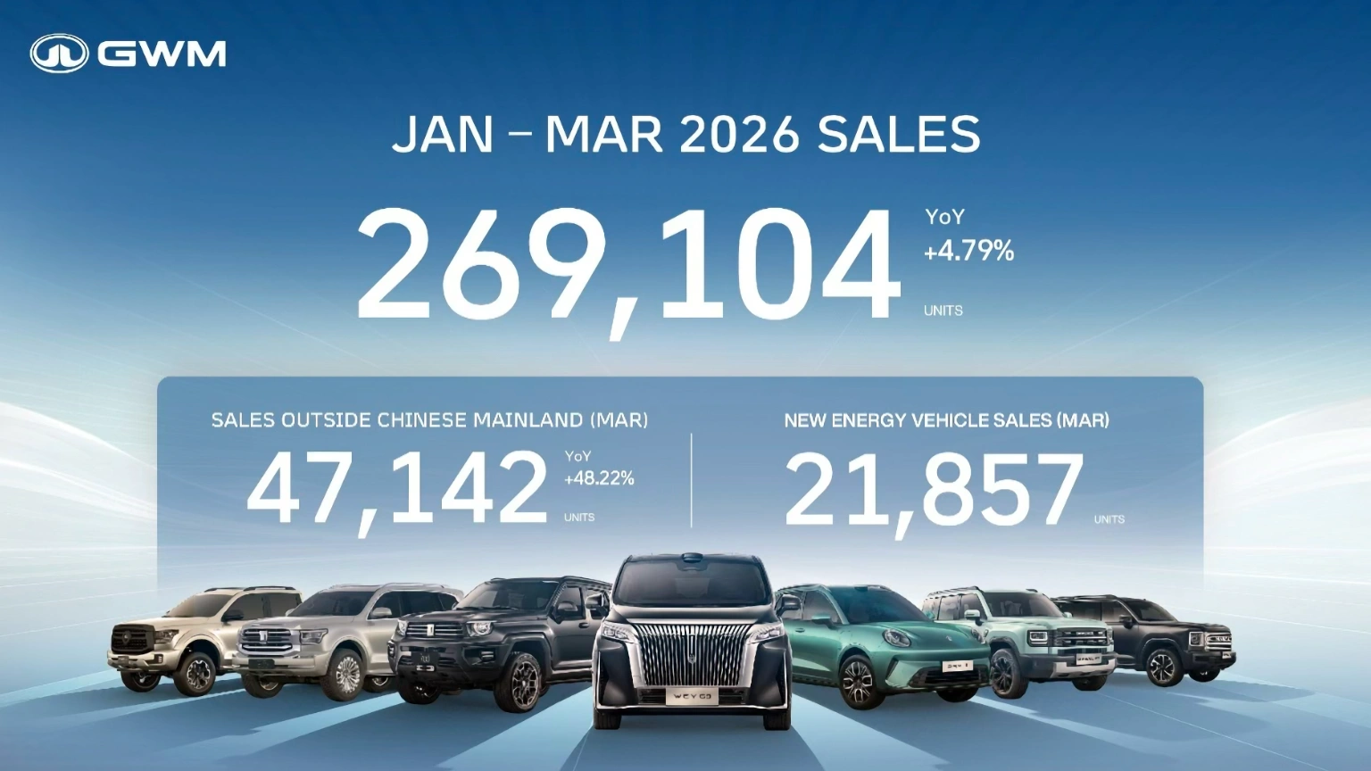 สำหรับกลุ่มรถยนต์พลังงานใหม่ (NEV) มียอดขายในเดือนมีนาคมอยู่ที่ 21,857 คัน รวมไตรมาสแรกมียอดสะสม 52,630 คัน สรุปภาพรวมสามเดือนแรกของปี 2026 GWM มียอดขายรวมทั้งสิ้น 269,104 คัน เติบโตขึ้น 4.79% สะท้อนถึงการเติบโตที่มั่นคงอย่างต่อเนื่อง