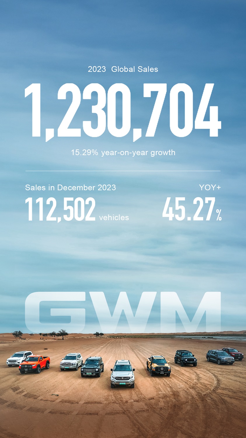 วันที่ 8 มกราคม 2567 ทาง Great Wall Motor เผยยอดขายประจำปี 2566 บรรลุความสำเร็จครั้งสำคัญในการขยายธุรกิจสู่ตลาดโลก ทำยอดขายรถยนต์รวมทั่วโลกทั้งหมด 1.23 ล้านคัน ซึ่งถือเป็นปีที่ 8 ที่ยอดขายทั่วโลกมากกว่า 1 ล้านคันอย่างต่อเนื่อง โดยเป็นยอดขายในตลาดต่างประเทศที่สูงเป็นประวัติการณ์ถึง 300,000 คัน ในเดือนธันวาคมที่ผ่านมามียอดขายเพิ่มสูงขึ้นอย่างน่าพึงพอใจ เพียงเดือนเดียวสามารถทำยอดขายถึง 33,476 คัน สะท้อนถึงการเติบโตที่แข็งแกร่งและการดำเนินธุรกิจในระดับสากลของบริษัทฯ