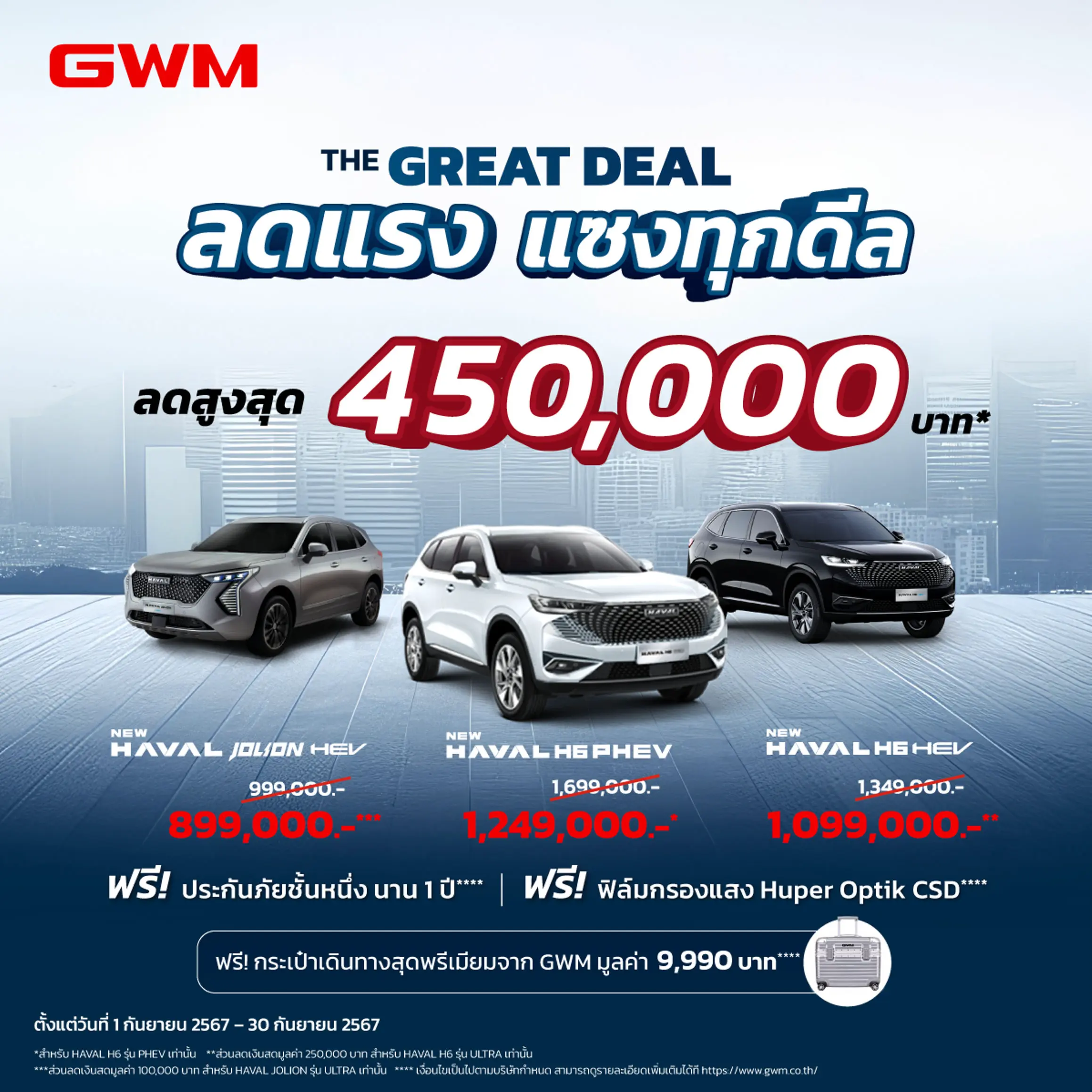 Great Wall Motor (ประเทศไทย) มอบข้อเสนอในราคาพิเศษที่คุ้มค่าที่สุด ภายใต้แคมเปญ “The GREAT DEAL ลดแรง แซงทุกดีล” ของทั้งเจ้าเหมียวไฮเทค GWM New ORA Good Cat ขวัญใจคนไทยทั้ง 3 รุ่น ได้แก่ รุ่น PRO, ULTRA และ GT รวมถึงรถเอสยูวีอัจฉริยะ GWM HAVAL รุ่นยอดนิยมอีก 3 รุ่น ตั้งแต่ New GWM HAVAL H6 Hybrid SUV รุ่น ULTRA, All New GWM HAVAL H6 Plug-in Hybrid SUV และ New GWM HAVAL JOLION Hybrid SUV รุ่น ULTRA ด้วยส่วนลดสูงสุดถึง 450,000 บาท ให้ชาวไทยทั่วประเทศได้เข้าถึงรถยนต์พลังงานใหม่ที่มีคุณภาพและอัดแน่นด้วยเทคโนโลยีอันทันสมัย ในราคาสุดคุ้ม ตั้งแต่วันที่ 1-30 กันยายน 2567