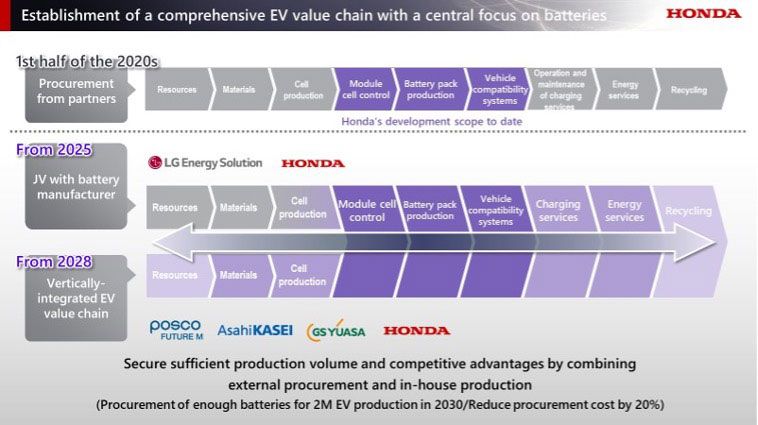 เนื่องด้วยการเติบโตที่ช้าของตลาดรถยนต์ไฟฟ้าในบางประเทศปัจจุบัน Honda ไม่ได้เบี่ยงเบนความตั้งใจออกจากการผลิตรถยนต์ไฟฟ้า Honda วางแผนพัฒนาเทคโนโลยีแบตเตอรี่ และสายการผลิต แบรนด์ได้กล่าวว่า ตั้งเป้าลงทุนมากถึง 10 พันล้านเหรียญสหรัฐ สำหรับรถยนต์ไฟฟ้าภายในปี 2030