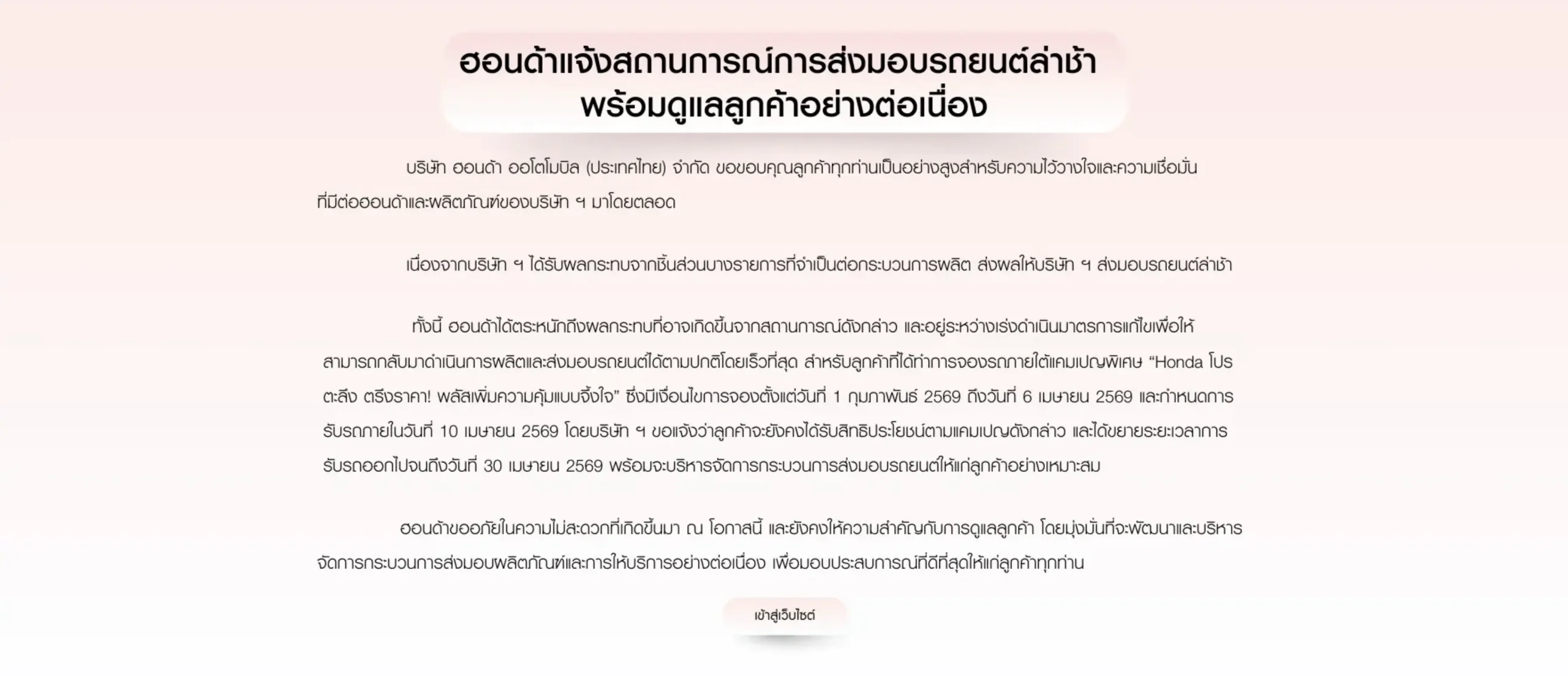 ทั้งนี้ ฮอนด้าได้ตระหนักถึงผลกระทบที่อาจเกิดขึ้นจากสถานการณ์ดังกล่าว และอยู่ระหว่างเร่งดำเนินมาตรการแก้ไขเพื่อให้สามารถกลับมาดำเนินการผลิตและส่งมอบรถยนต์ได้ตามปกติโดยเร็วที่สุด สำหรับลูกค้าที่ได้ทำการจองรถภายใต้แคมเปญพิเศษ “Honda โปรตะลึง ตรึงราคา! พลัสเพิ่มความคุ้มแบบจึ้งใจ” ซึ่งมีเงื่อนไขการจองตั้งแต่วันที่ 1 กุมภาพันธ์ 2569 ถึงวันที่ 6 เมษายน 2569 และกำหนดการรับรถภายในวันที่ 10 เมษายน 2569 โดยบริษัทฯ ขอแจ้งว่าลูกค้าจะยังคงได้รับสิทธิประโยชน์ตามแคมเปญดังกล่าว และได้ขยายระยะเวลาการรับรถออกไปจนถึงวันที่ 30 เมษายน 2569 พร้อมจะบริหารจัดการกระบวนการส่งมอบรถยนต์ให้แก่ลูกค้าอย่างเหมาะสม