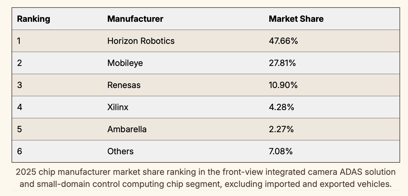 ในปี 2025 Horizon Robotics ครองส่วนแบ่งตลาดถึง 47.66% ในกลุ่มโซลูชัน ADAS แบบกล้องหน้าที่รวมการประมวลผล และชิปควบคุมโดเมนขนาดเล็ก