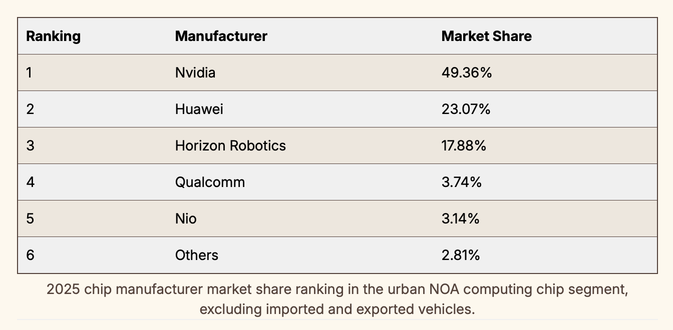 ในตลาดชิปประมวลผล Urban NOA, Nvidia ครองส่วนแบ่งตลาดสูงถึง 49.36% ขณะที่ Nvidia, Huawei และ Horizon Robotics รวมกันครองส่วนแบ่งตลาดมากกว่า 90% ของตลาดทั้งหมด