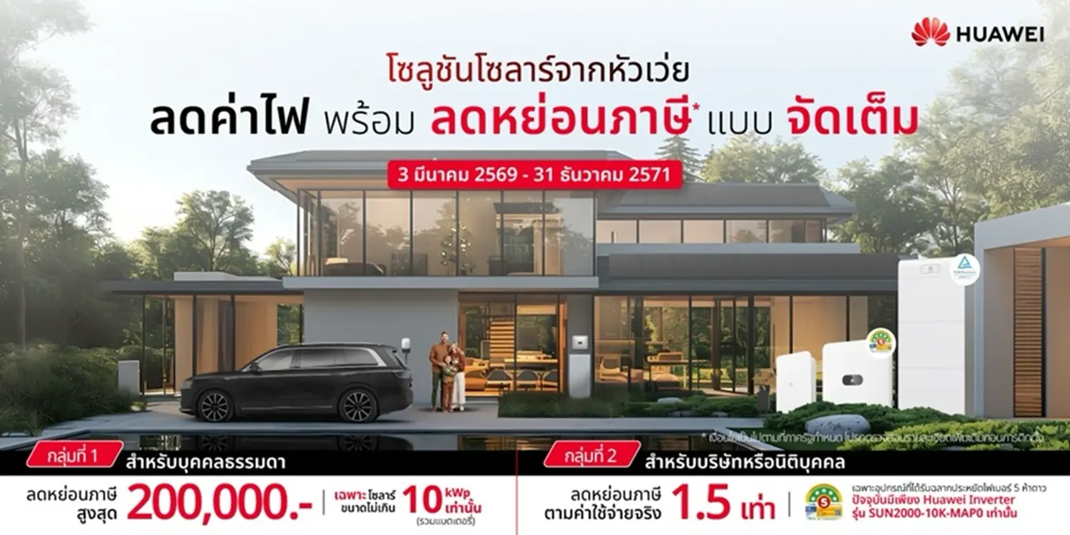 Huawei ขึ้นแท่นแบรนด์โซลาร์รายเดียวที่ผ่านเกณฑ์มาตรการลดหย่อนภาษีรัฐบาล หนุนการติดตั้งโซลาร์รูฟท็อป