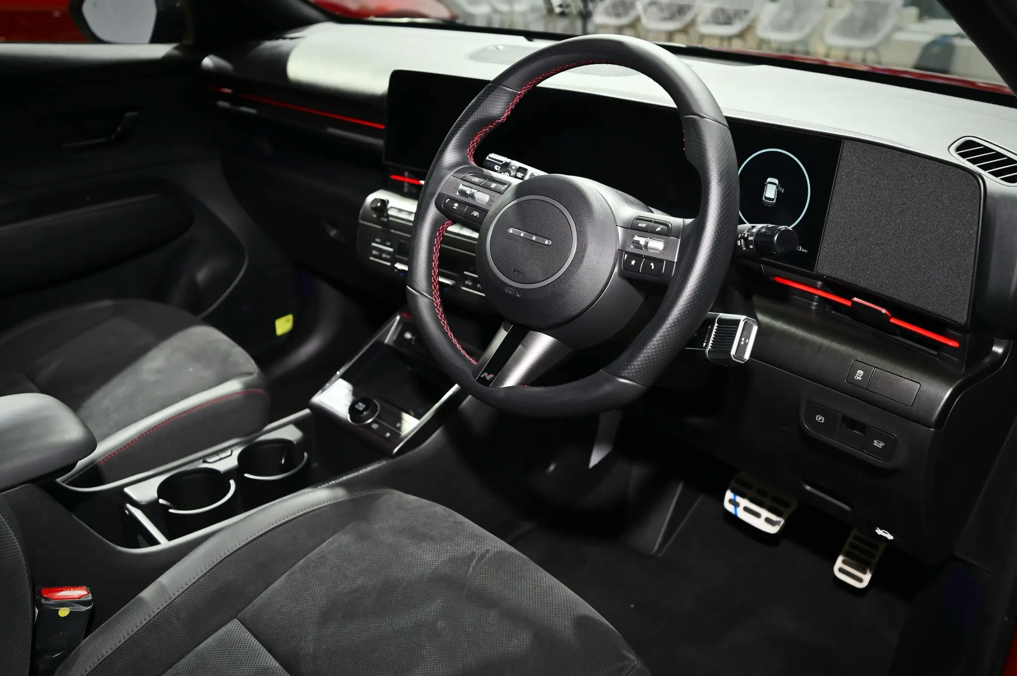 ห้องโดยสารพรีเมียมที่ตกแต่งด้วย เบาะหนัง Alcantara ประทับโลโก้ N สะดวกสบายด้วยเบาะคนขับปรับไฟฟ้าเสมือนไร้แรงโน้มถ่วง Zero Gravity, แผงคอนโซลดีไซน์พิเศษ และพวงมาลัยหนังเดินตะเข็บแดง มาพร้อม จอ Infotainment 12.3 นิ้ว รองรับ Wireless Apple CarPlay และ Android Auto ผสานสมรรถนะและดีไซน์สปอร์ตที่แตกต่างอย่างมีเอกลักษณ์ พร้อมระบบความปลอดภัย Hyundai SmartSense อย่างครบครัน ในราคา 1,988,000 บาท