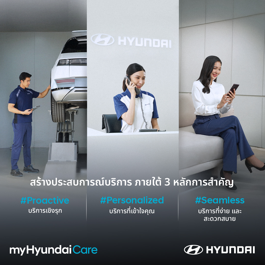 myHyundaiCare ขับเคลื่อนด้วย 3 แนวคิดหลัก ที่มุ่งสร้างประสบการณ์บริการที่เหนือกว่าในทุกมิติ โดยยึดหลักการให้บริการ 3 ด้านสำคัญ ดังนี้ #Proactive บริการเชิงรุก ที่ให้ความสำคัญกับการบำรุงรักษาเชิงป้องกัน ผ่านระบบ GDS (Global Diagnostic System) เพื่อตรวจสอบสภาพและวิเคราะห์ปัญหาอย่างแม่นยำ พร้อมกิจกรรมศูนย์บริการเคลื่อนที่ (Before Service – Outreach Activity) ที่นำทีมช่างผู้เชี่ยวชาญลงพื้นที่ให้บริการถึงจังหวัดต่าง ๆ ทั่วประเทศ, #Personalized – บริการที่เข้าใจคุณ ตอบโจทย์ทุกไลฟ์สไตล์ ผ่านโปรแกรมเฉพาะบุคคล เช่น IONIQ Premium Care สำหรับเจ้าของรถยนต์ไฟฟ้า และ EV Special Care โปรแกรมตรวจเช็กเฉพาะทางสำหรับรถ EV รวมถึงบริการเช็กระยะนอกสถานที่ (Mobile Service) ที่มอบความสะดวกสบายด้วยการตรวจเช็กและซ่อมนอกสถานที่อย่างครบวงจร และ #Seamless – บริการที่ง่ายและสะดวกสบายตั้งแต่การจองคิวออนไลน์การติดตามสถานะบริการแบบเรียลไทม์ไปจนถึงการเชื่อมโยงข้อมูลกับศูนย์บริการทั่วประเทศเพื่อมอบประสบการณ์ที่ไร้รอยต่อทุกขั้นตอน