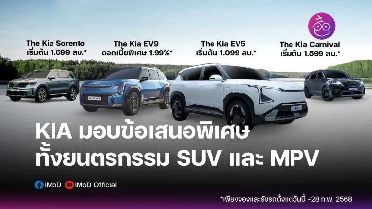 เกีย เซลส์ ประเทศไทย มอบข้อเสนอราคาพิเศษ ครอบคลุมยนตรกรรม SUV และ MPV ไฟฟ้าและเครื่องสันดาป 4 รุ่นหลัก ประกอบด้วย The Kia EV5, The Kia EV9, The Kia Carnival และ The Kia Sorento มาพร้อมแพ็กเกจคุ้มครองสุดพิเศษ เพื่อให้ทุกคนได้เป็นเจ้าของยนตรกรรมอเนกประสงค์ที่ตอบโจทย์การขับขี่และเดินทางในหลากหลายสไตล์ได้ง่ายยิ่งขึ้น