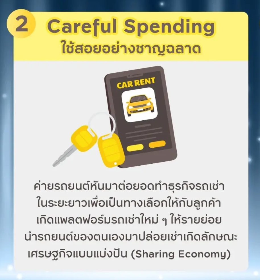 คนไทยมีแนวโน้มในการใช้สอยอย่างชาญฉลาดมากยิ่งขึ้น เนื่องด้วยความกังวลด้านเศรษฐกิจและหนี้ครัวเรือน ทำให้การใช้งานแบบสมัครสมาชิกหรือการทดลองเช่าระยะสั้นในหลากหลายธุรกิจเป็นที่นิยมมากขึ้น อย่างการหันมาเช่าใช้รถ เฉลี่ย 2-3 ปีต่อรถหนึ่งคัน แทนการซื้อครอบครอง ไม่ต้องผูกพันในระยะยาว เพื่อซื้อประสบการณ์การใช้รถ เพิ่มความยืดหยุ่นในการใช้ชีวิต และลดภาระค่าใช้จ่าย