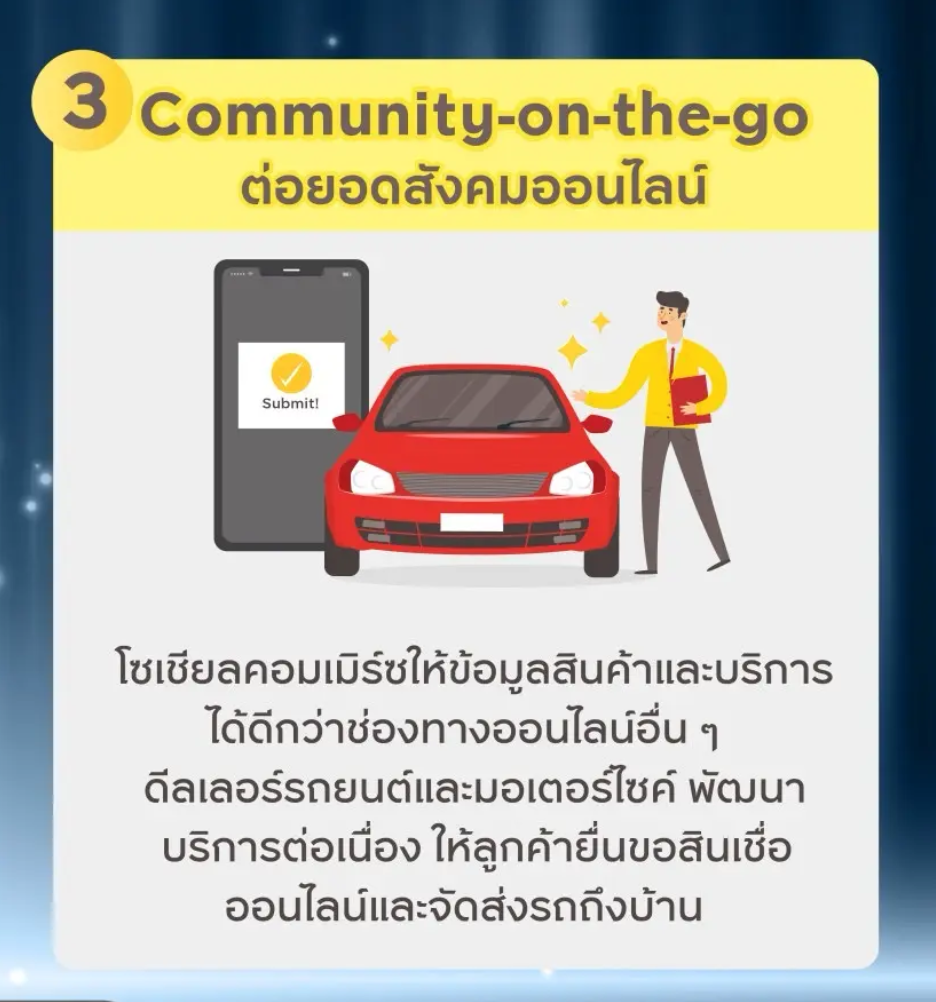 สังคมออนไลน์กลายมาเป็นช่องทางหลักของผู้บริโภคในการหาข้อมูลและการติดต่อซื้อขายสินค้า การเข้ามาของโซเชียลคอมเมิร์ซทำให้ผู้ขายสามารถให้ข้อมูลเกี่ยวกับสินค้าและบริการได้ดีขึ้นกว่าช่องทางออนไลน์อื่น ๆรถยนต์มือสองเป็นอีกหนึ่งธุรกิจที่กำลังเติบโตในช่องทางนี้ เพราะผู้ใช้รถสามารถดูสภาพรถ และค้นหาข้อมูลได้อย่างละเอียด รวมถึงตรวจสอบประวัติรถ เช่น เลขไมล์ และการรับรองคุณภาพ ช่วยให้ตัดสินใจได้ง่ายขึ้นโดยไม่ต้องเดินทางไปโชว์รูมหรือเต็นท์รถ ปัจจุบันดีลเลอร์หลายรายพัฒนาบริการแบบต่อเนื่อง ให้ลูกค้าสามารถยื่นขอสินเชื่อออนไลน์กับสถาบันการเงินได้ทันที และจัดส่งรถยนต์ถึงบ้าน ทำให้กระบวนการซื้อสะดวก รวดเร็ว มีความโปร่งใส และสร้างความเชื่อมั่นได้มากขึ้น