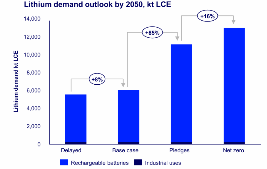 หากรัฐบาลต่าง ๆ ทำตามคำมั่นห้ามขายรถเครื่องยนต์สันดาปตามกำหนด จะต้องการลิเธียมเพิ่มเติม 6.7 ล้านตัน LCE ภายในปี 2050 ภาวะขาดดุลจะเริ่มประมาณปี 2029 และต่อเนื่องจนถึงปี 2050