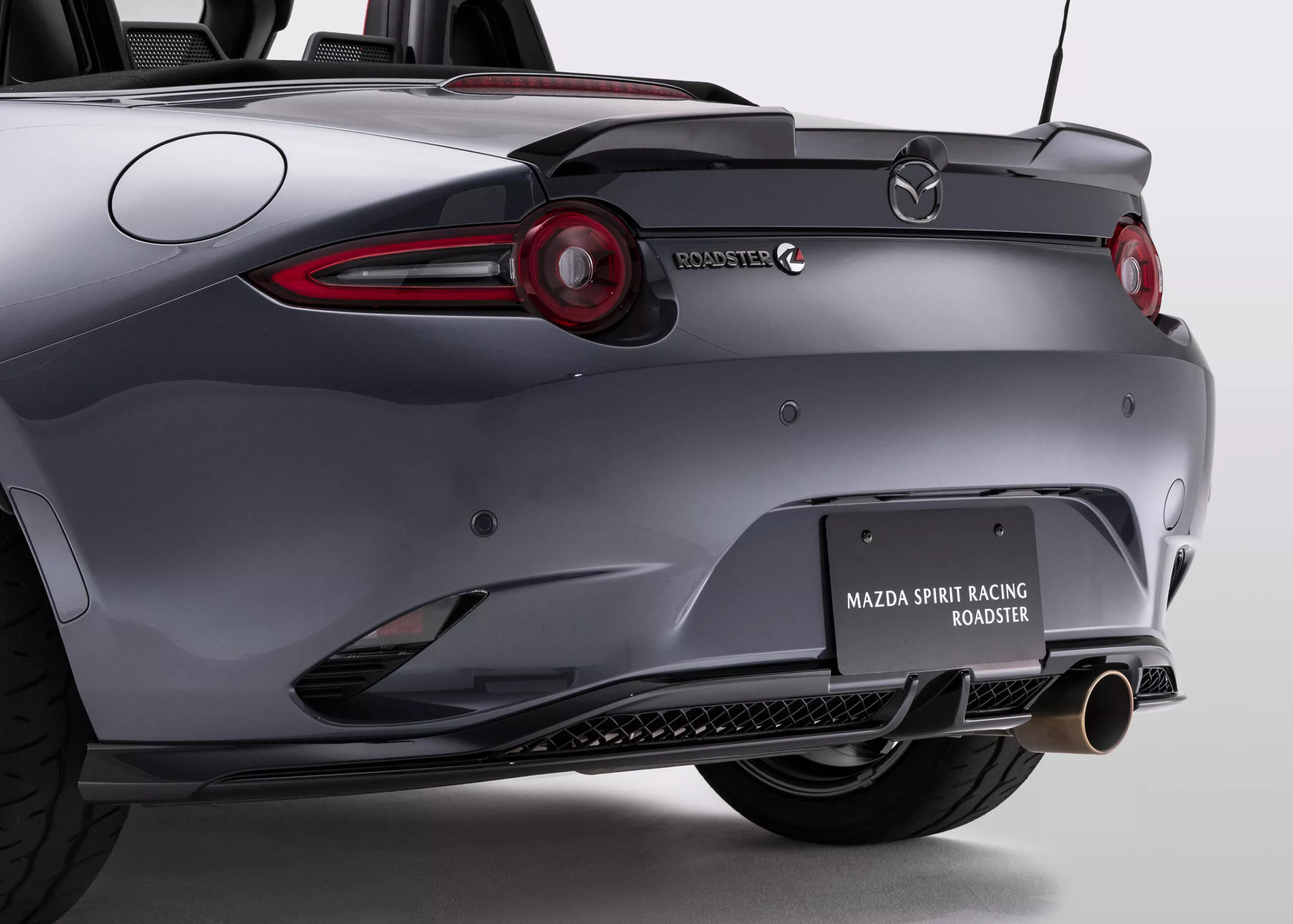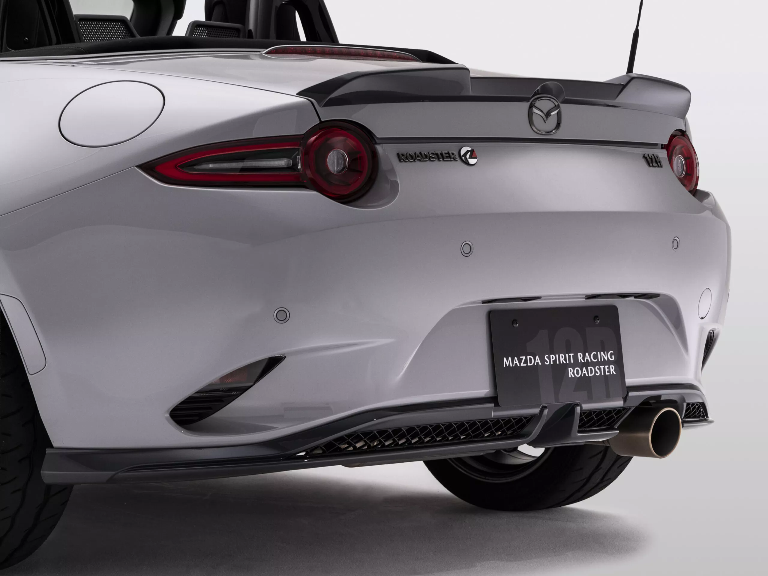 รุ่น MX-5 Spirit Racing 12R โดดเด่นด้วยสีตัวถัง Aero Gray ตัดด้วยสีเทาเข้มในส่วนของ สปลิตเตอร์หน้า, สเกิร์ตข้าง และสปอยเลอร์หลัง พร้อมลวดลายตกแต่งพิเศษเฉพาะรุ่น เสริมเอกลักษณ์ให้กับรถเปิดประทุนสปอร์ตคันนี้ได้อย่างลงตัว