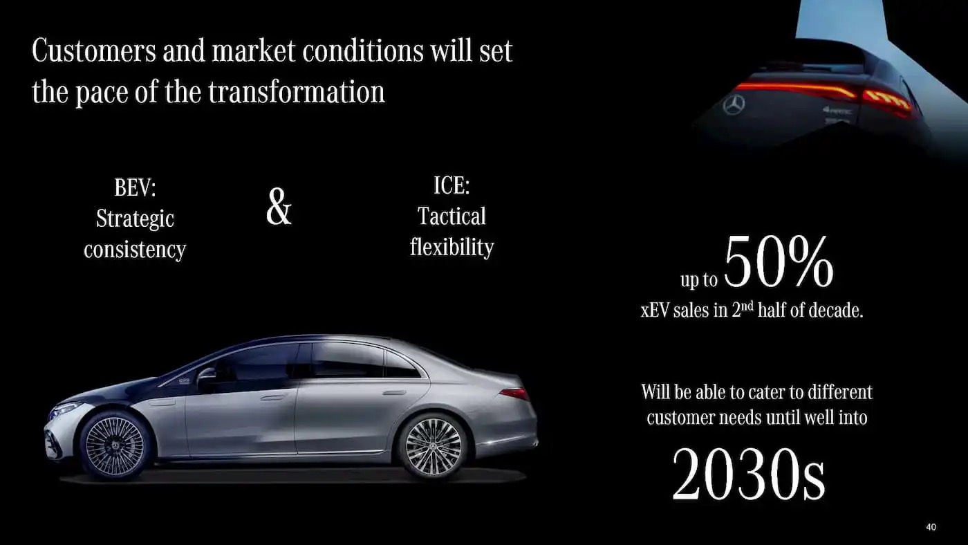 ถึงแม้ว่าปัจจุบันรถยนต์ไฟฟ้าล้วนของ Mercedes-Benz ได้เปิดตัวออกมาแล้วทุกเซกเมนท์ ได้แก่ รถยนต์ไฟฟ้าซีดาน EQS และ EQE, รถ SUV ไฟฟ้า EQB แต่ยอดขายรถยนต์ไฟฟ้าก็ยังไม่มีแนวโน้มว่าจะถึง 50% ในปี 2025