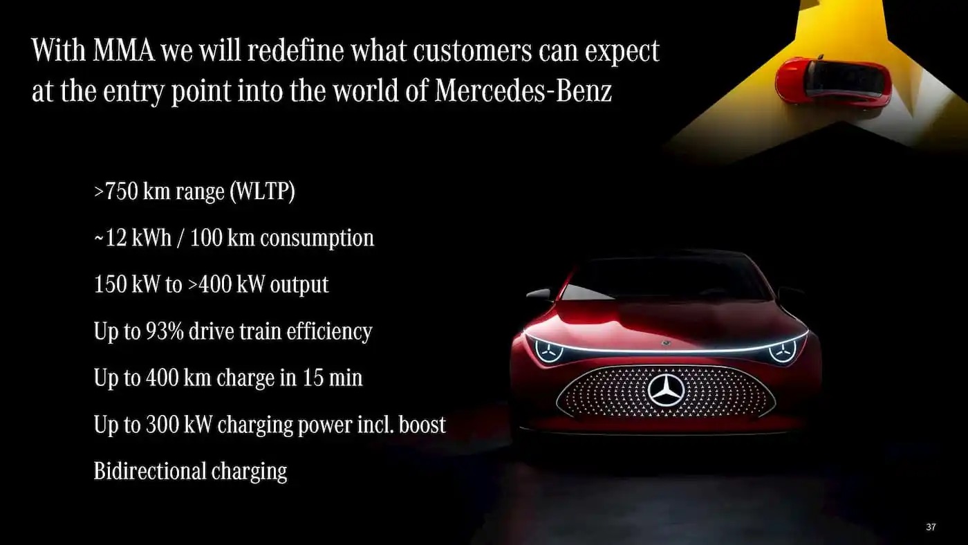 แผนต่อไปของ Mercedes-Benz คือการเปิดตัวรถยนต์ไฟฟ้าระดับเริ่มต้นที่ใช้สถาปัตยกรรม MMA และเป็นรถที่ลดต้นทุนลงประมาณ 30% คาดว่าจะเป็นรถรุ่น CLA ไฟฟ้าล้วน มีระยะทางประมาณ 750 กม. (WLTP) พร้อมระบบชาร์จเร็ว ชาร์จเพียง 15 นาที วิ่งได้ไกลอีก 400 กม. ก็รอติดตามกันต่อไปว่ารถยนต์ไฟฟ้าระดับเริ่มต้นนี้จะช่วยให้บริษัทบรรลุเป้าหมายที่ปรับใหม่หรือใหม่
