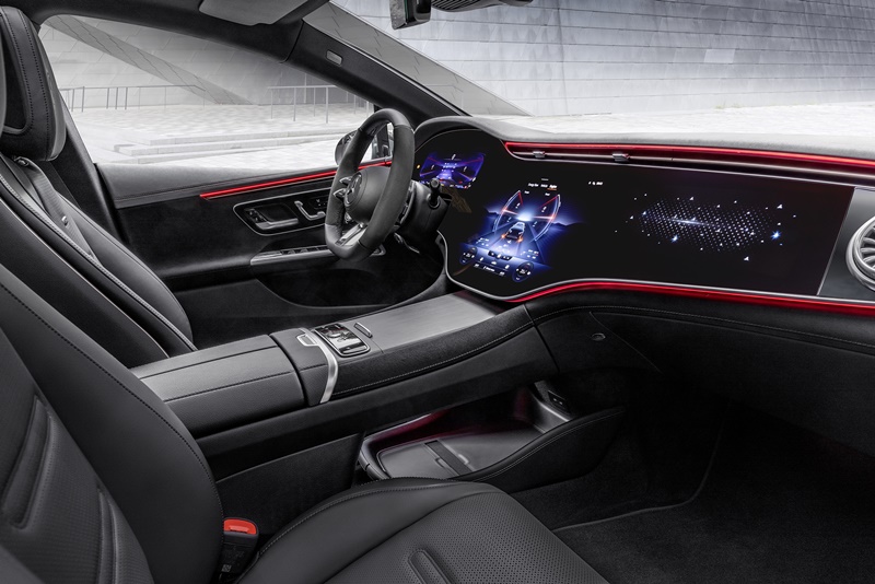 แผงหน้าปัดด้านหน้าตกแต่งด้วยหนังแบบเดียวกับเบาะนั่ง พร้อมทั้งเดินด้ายตะเข็บจริงสีแดง พวงมาลัย AMG Performance ทรง D-shape หุ้มด้วยหนัง Nappa เจาะรู พร้อมก้าน Paddle Shift แบบ Aluminium เพื่อปรับระดับแรงหน่วงเพื่อนำพลังงานชาร์จกลับเข้าแบตเตอรี่ รวมถึงแป้นเหยียบแบบสปอร์ต ระบบนำทางที่ติดตั้งยังมาพร้อมกับความสามารถ Electric Intelligence เพื่อคำนวณหาเส้นทางที่สั้นที่สุดและสะดวกต่อการขับขี่ ด้วยการรวมตำแหน่งสถานีชาร์จและบรรจุอยู่ในเส้นทาง โดยที่จะปรับเปลี่ยนตำแหน่งตามสภาพจราจรและรูปแบบการขับขี่ของคนขับ ระบบนี้จะใช้ฐานข้อมูลจาก Cloud System ผนวกกับ Onboard Data เพื่อวิเคราะห์เส้นทางให้ได้ละเอียดแม่นยำที่สุด