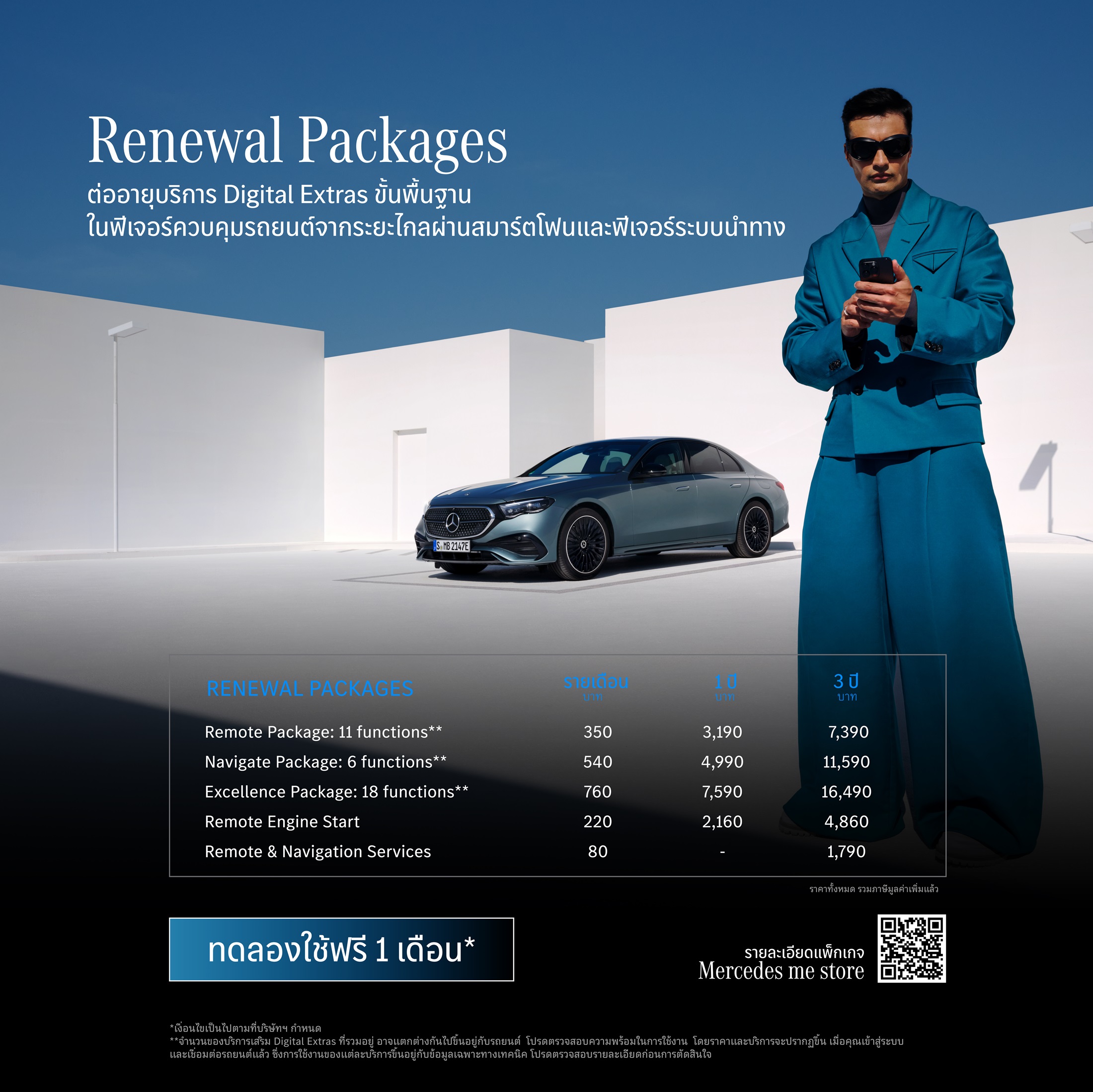 Renewal Packages : การต่ออายุบริการ Digital Extras ขั้นพื้นฐาน สำหรับลูกค้ารถยนต์เมอร์เซเดส-เบนซ์ ตั้งแต่ปี 2019 เป็นต้นไป ที่รองรับแอปพลิเคชัน Mercedes me และหมดอายุการใช้งาน Digital Extras ฟรี 3 ปีแรก* ในราคาแบบรายเดือน เริ่มต้นเพียง 80 บาท/เดือน* ดังนี้