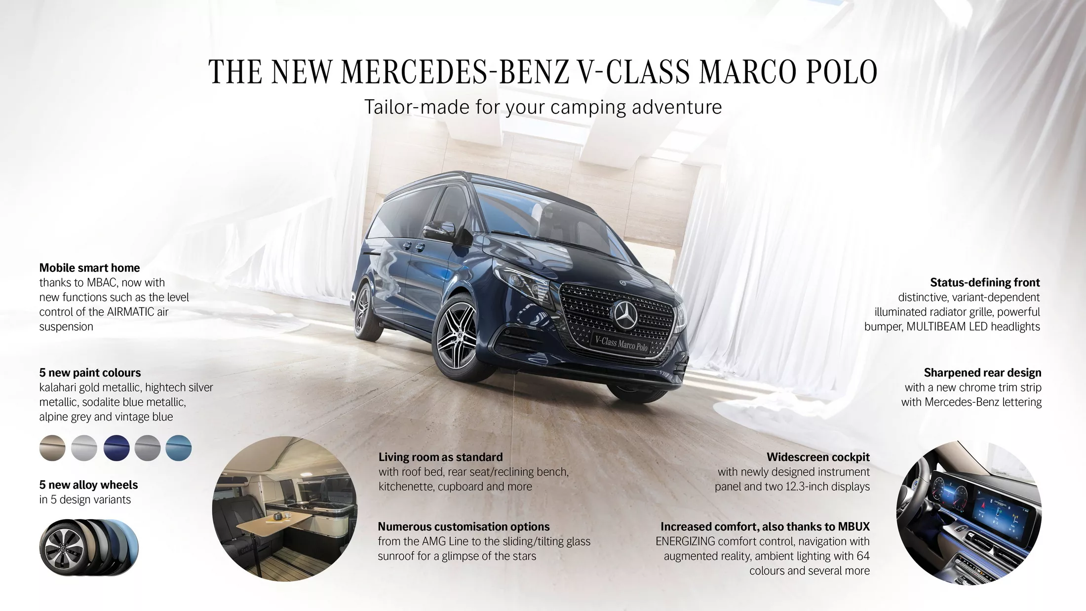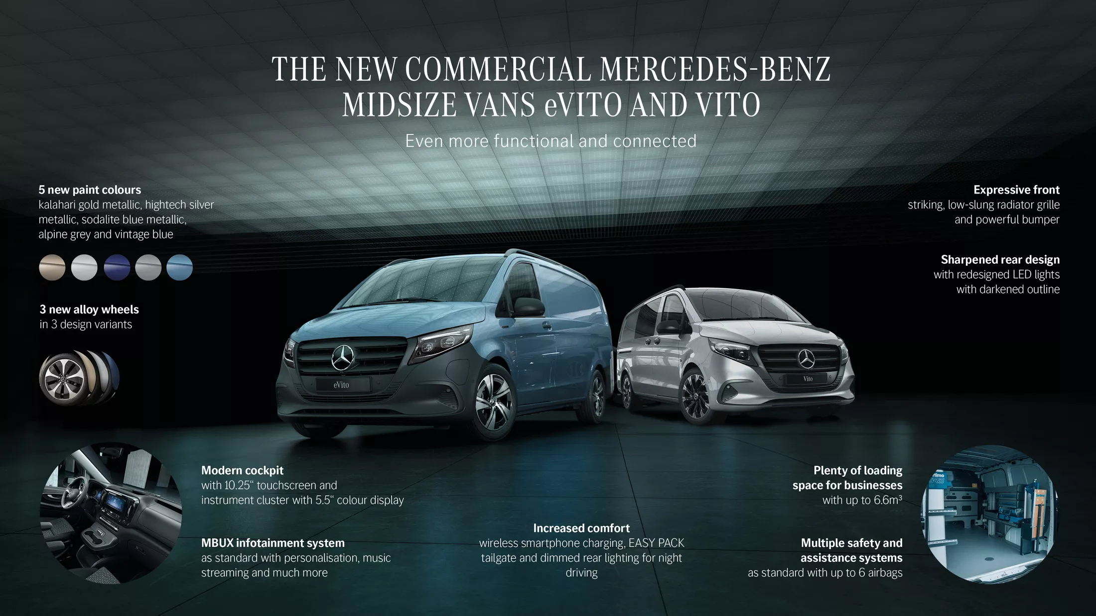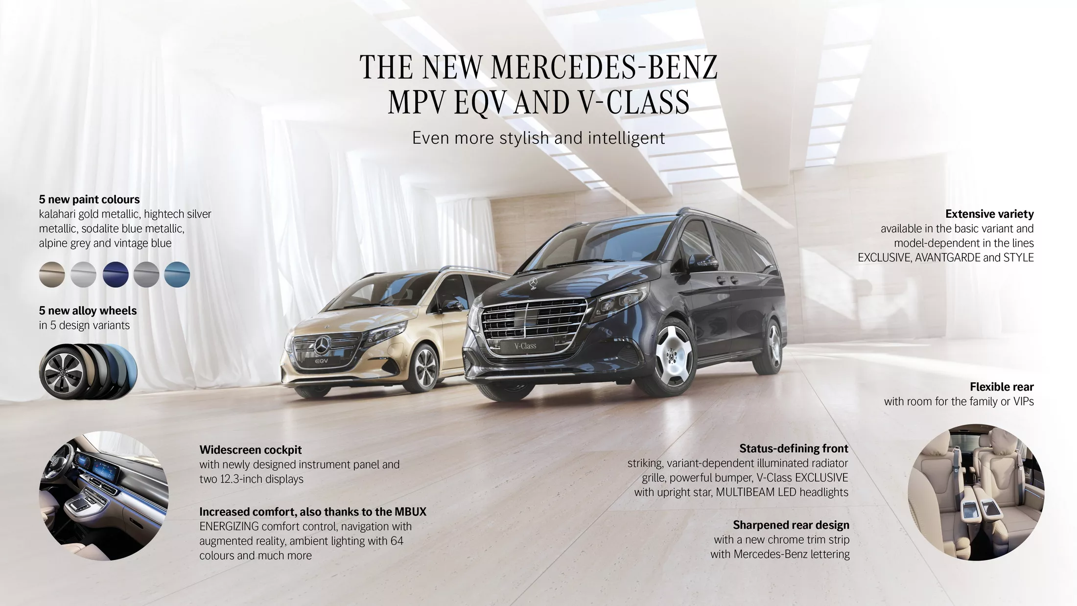 Mercedes-Benz ได้อัปเดตตระกูลรถตู้ขนาดกลางทั้งหมด รวมถึงรุ่นรถตู้โดยสารและรถตู้เชิงพาณิชย์ ทั้งในรุ่นที่ขับเคลื่อนด้วยเครื่องยนต์สันดาป และขับเคลื่อนด้วยไฟฟ้า 100% ทำให้มีความพรีเมียมมากขึ้นกว่าเดิม ทั้งในรุ่น EQV, รถตู้โดยสาร V-Class, V-Class Marco Polo, Vito และ eVito การปรับโฉมใหม่หมดทั้งภายนอกและภายใน เพื่อเพิ่มความปลอดภัย ความสะดวกสบาย และอุปกรณ์เทคโนโลยีที่ทันสมัยมากขึ้น