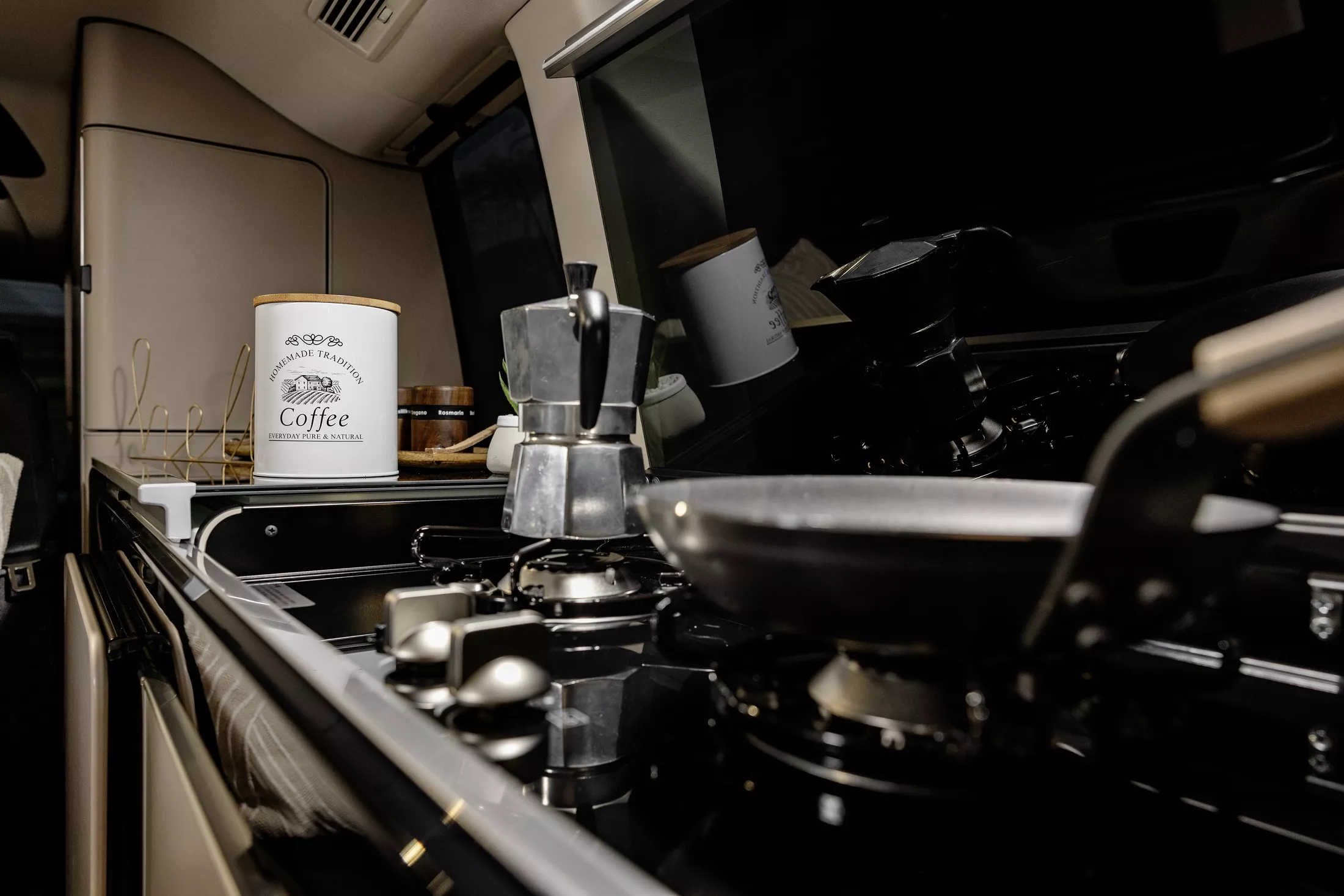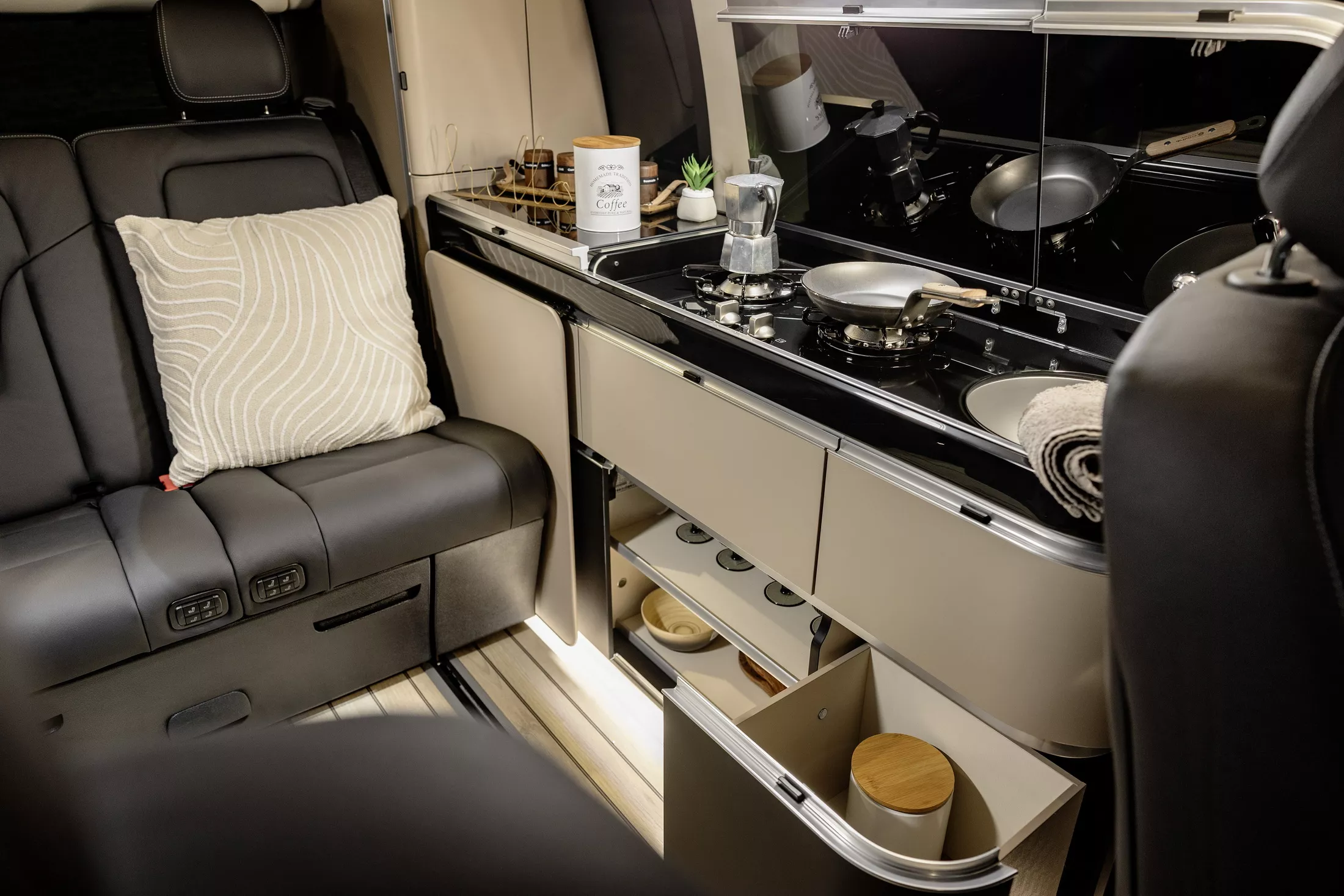 และในรุ่น V-Class Marco Polo ภายในจะถูกตกแต่งแนวแคมป์ปิ้ง มีที่นอน, อ่างล้างจาน, ครัวเล็กๆไว้ทำอาหาร และโต๊ะกินข้าว
