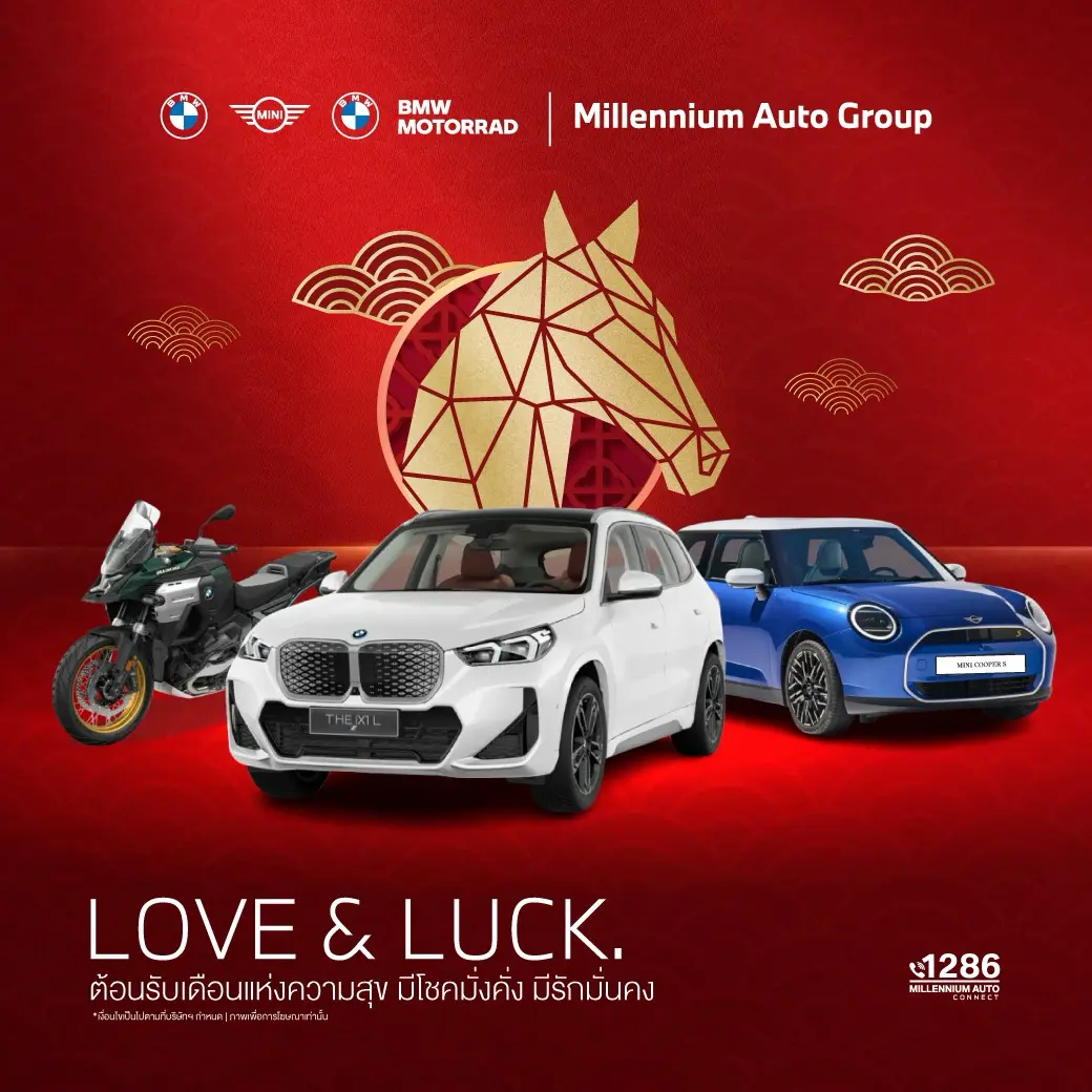 บริษัท Millennium Auto Group ผู้จำหน่ายรถยนต์ BMW, MINI และมอเตอร์ไซค์ BMW Motorrad อย่างเป็นทางการในประเทศไทย ภายใต้ MGC-ASIA ร่วมฉลองเดือนแห่งความรักและความมงคล จัดแคมเปญ LOVE & LUCK เชื่อมโยงเทศกาลวาเลนไทน์และตรุษจีน พร้อมกิจกรรมและข้อเสนอพิเศษตลอดเดือนกุมภาพันธ์ 2569 ที่โชว์รูม BMW Millennium Auto และ MINI Millennium Auto ทุกสาขาทั่วประเทศ