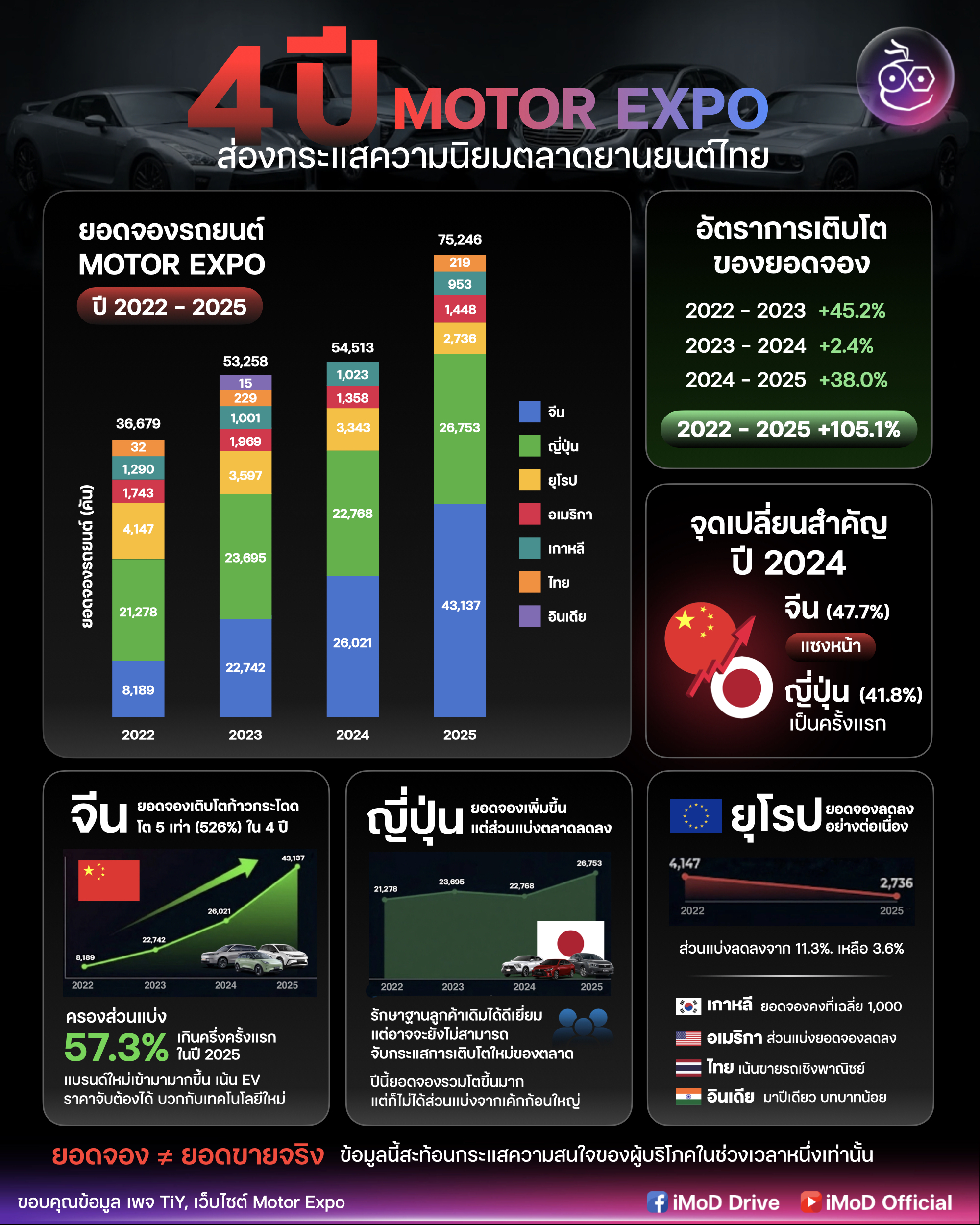 ข้อมูลตัวเลขที่ปรากฏทั้งหมดนี้ เป็นเพียง “ยอดจองรถยนต์” ที่เกิดขึ้นเฉพาะภายในพื้นที่งาน Motor Expo (มหกรรมยานยนต์) ตั้งแต่ปี 2022 ถึงปี 2025 เท่านั้น ไม่ใช่ยอดขายรวมทั้งประเทศตลอดทั้งปี