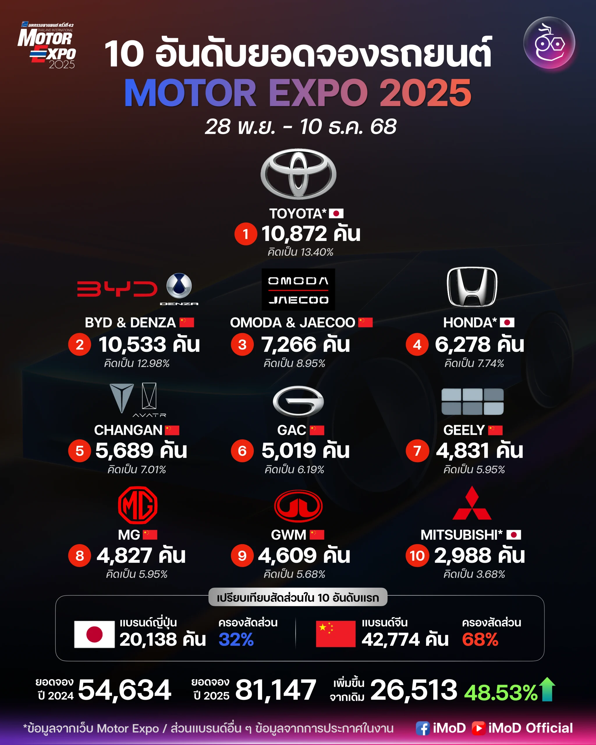 Motor Expo ปี 2024 (งานครั้งที่ 41) คือจุดเปลี่ยน โดยแบรนด์จีน (47.7%) สามารถทำยอดจองแซงหน้า แบรนด์ญี่ปุ่น (41.8%) ได้เป็นครั้งแรก และในปี 2025 ช่องว่างนี้ก็กว้างขึ้น
