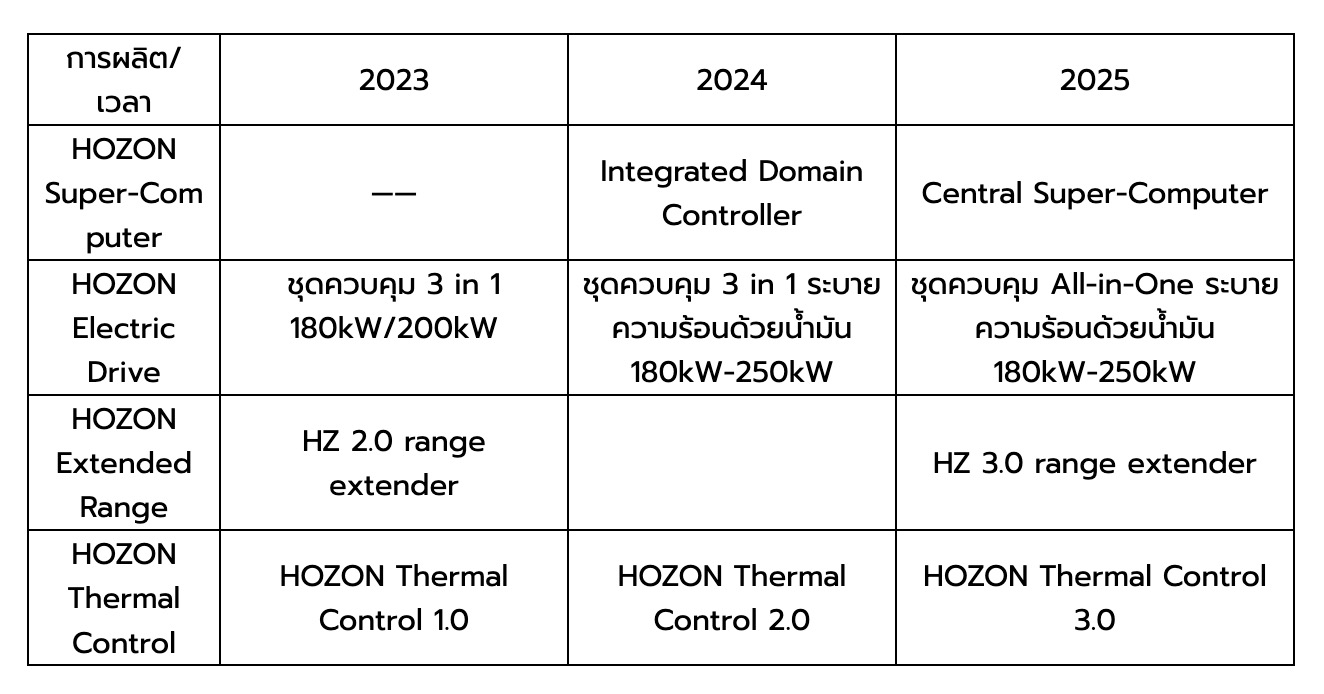 - ระยะที่สาม: วางแผนพัฒนา HOZON Thermal Control System 3.0 ที่มาพร้อมสารทำความเย็นใหม่ เพื่อก้าวสู่ผู้นำในอุตสาหกรรมด้านการบูรณาการระบบ ประสิทธิภาพการทำงาน และการขยายช่วงอุณหภูมิ”