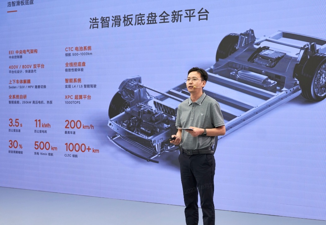 HOZON Skateboard Chassis เป็นเทคโนโลยียานยนต์ไฟฟ้าชั้นนำอันดับที่ 2 ที่เปิดตัวในงาน โดยเป็นแพลตฟอร์มที่ใช้กับยานยนต์ไฟฟ้าหลากหลายรุ่นทั่วโลก มาพร้อมคุณสมบัติที่โดดเด่น เช่น ประสิทธิภาพสูง แข็งแรงทนทาน รองรับ C-rate สูง การพัฒนาแบบแยกส่วนของโครงสร้างตัวถังทั้งช่วงบนและส่วนล่าง ผสานกับซอฟต์แวร์และฮาร์ดแวร์ที่ทันสมัย เพิ่มประสิทธิภาพการผลิตมากถึง 20 เท่า ลดพื้นที่การผลิตลง 50% และลดการใช้ทรัพยากรในการวิจัยและพัฒนาลง 30% ส่งผลให้ต้นทุนการผลิตต่ำลงและประสิทธิภาพกระบวนการผลิตเพิ่มขึ้น