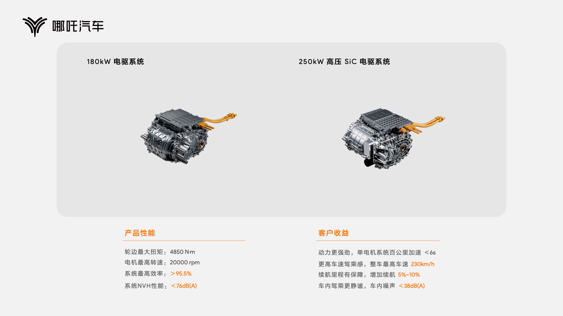 HOZON Electric Drive ระบบขับเคลื่อนไฟฟ้าสมรรถนะสูงซึ่งเปรียบเสมือนเป็น “หัวใจ” และ “กล้ามเนื้อ” ที่แข็งแกร่งของยานยนต์อัจฉริยะจาก NETAระบบขับเคลื่อนไฟฟ้าถูกแบ่งออกเป็นสองประเภท ได้แก่ ระบบขับเคลื่อนด้วยไฟฟ้า 180 กิโลวัตต์ 400 โวลต์ และระบบขับเคลื่อนด้วยไฟฟ้า 250 กิโลวัตต์ 800 โวลต์ แบบ SiC ซึ่งมาพร้อมคุณลักษณะสำคัญ 4 ประการคือ “ประสิทธิภาพสูง ระยะทางในการขับขี่ที่ไกลขึ้น มอบความสบายเหนือระดับ และระบบที่เสถียร”