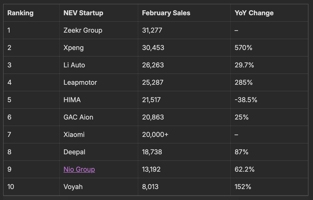 จัดอันดับยอดขายรถพลังงานใหม่ (NEV) แบรนด์สตาร์ทอัพจีนในเดือนกุมภาพันธ์ 2025