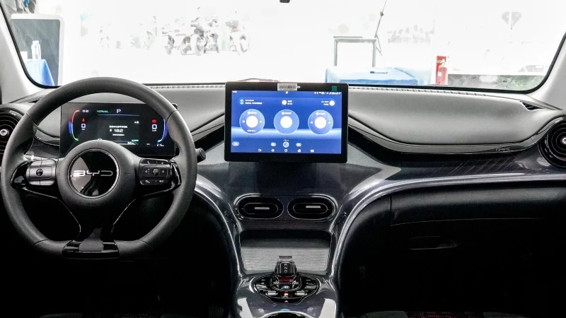 การตกแต่งภายใน BYD ดีไซน์ใหม่ทั้งหมด มีแผงหน้าปัด ขนาด 8.8 นิ้ว และหน้าจอสัมผัส infotainment ขนาด 12.8 นิ้ว แบบปรับหมุนได้ สามารถใช้งานได้ทั้งแนวตั้งและแนวนอน ซึ่งเป็นเอกลักษณ์ของ BYD ในทุกๆรุ่น BYD e2 ยังรองรับการ์ด NFC เครื่องเสียงมีระบบบลูทูธ และมีปั๊มความร้อนเป็นมาตรฐาน และมาพร้อมพวงมาลัยทรงท้ายตัดแบบสามก้าน ทำให้ใกล้เคียงรุ่นอื่นๆ ในซีรีส์ Ocean ของ BYD มากขึ้น