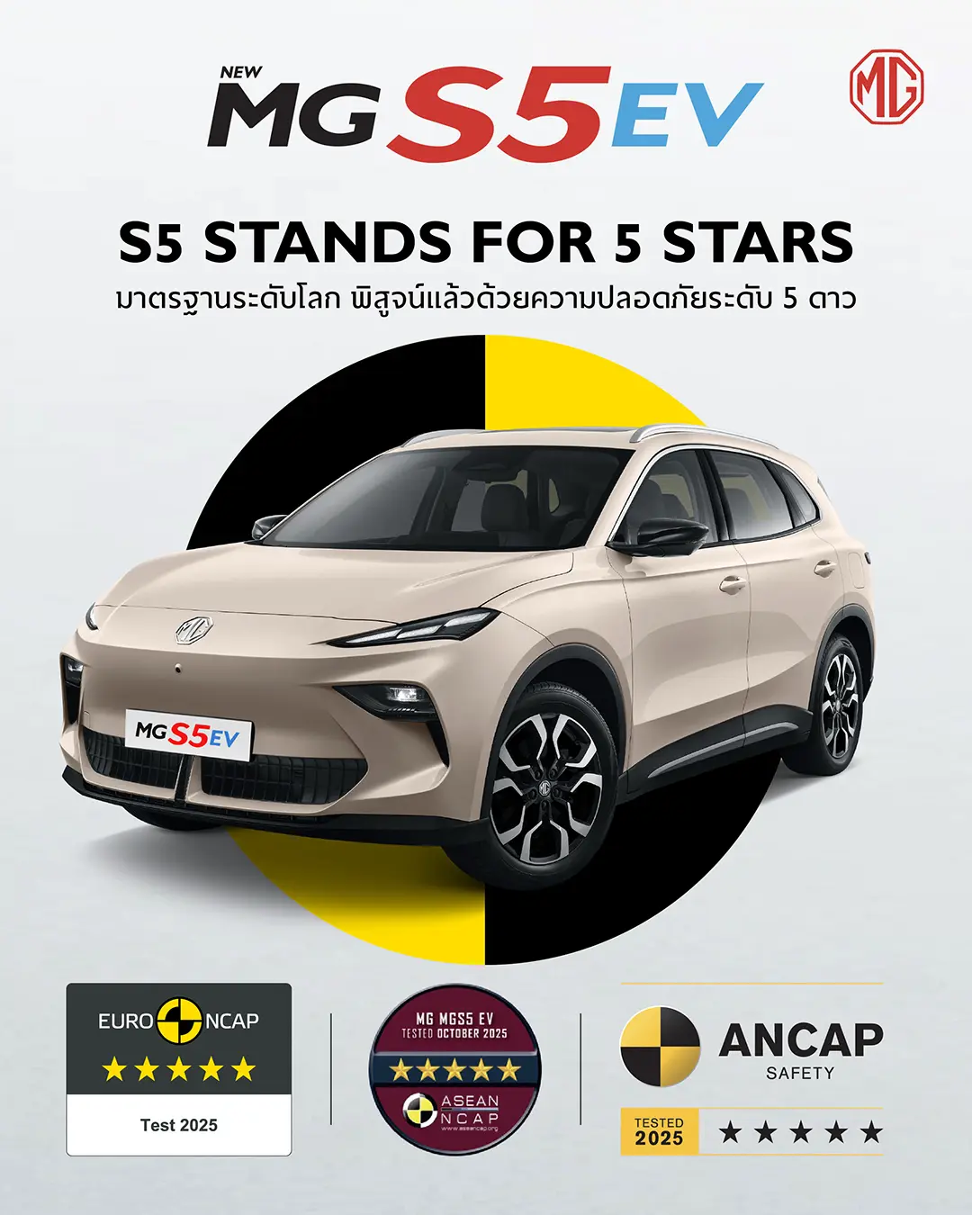 NEW MG S5 EV คว้า มาตรฐานความปลอดภัย 5 ดาว ASEAN NCAP ขึ้นแท่นเอสยูวีไฟฟ้าที่ขับขี่ปลอดภัยระดับโลก