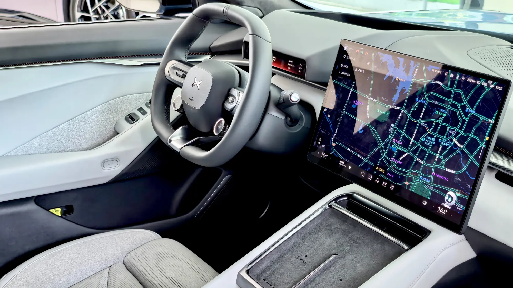 การตกแต่งภายในของ XPENG P7 รุ่นใหม่มีให้เลือก 3 โทนสี ได้แก่ เทาเข้ม, เทาอ่อน และสีม่วง คอนโซลกลางมีพวงมาลัยแบบสามก้านที่หุ้มด้วยหนัง Nappa พร้อมปุ่มควบคุมสองปุ่มที่ช่วยให้ผู้ขับขี่สามารถควบคุมโหมดการขับขี่ ระบบช่วงล่างแบบถุงลม และฟังก์ชันการขับขี่อัจฉริยะต่าง ๆ ได้