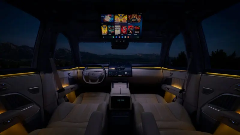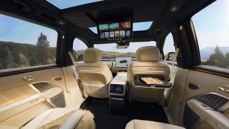 มาพร้อมระบบเสียง Onvo และหน้าจอติดเพดานสำหรับผู้โดยสารด้านหลัง นอกจากนี้ยังมีการบุเสาและเพดานด้วยไมโครไฟเบอร์ มีตู้เย็นในตัว ตรงคอนโซลกลางใช้หน้าจอสัมผัสขนาดใหญ่ 17.2 นิ้ว ความละเอียด 3K และมีถุงลมนิรภัย 9 ใบ