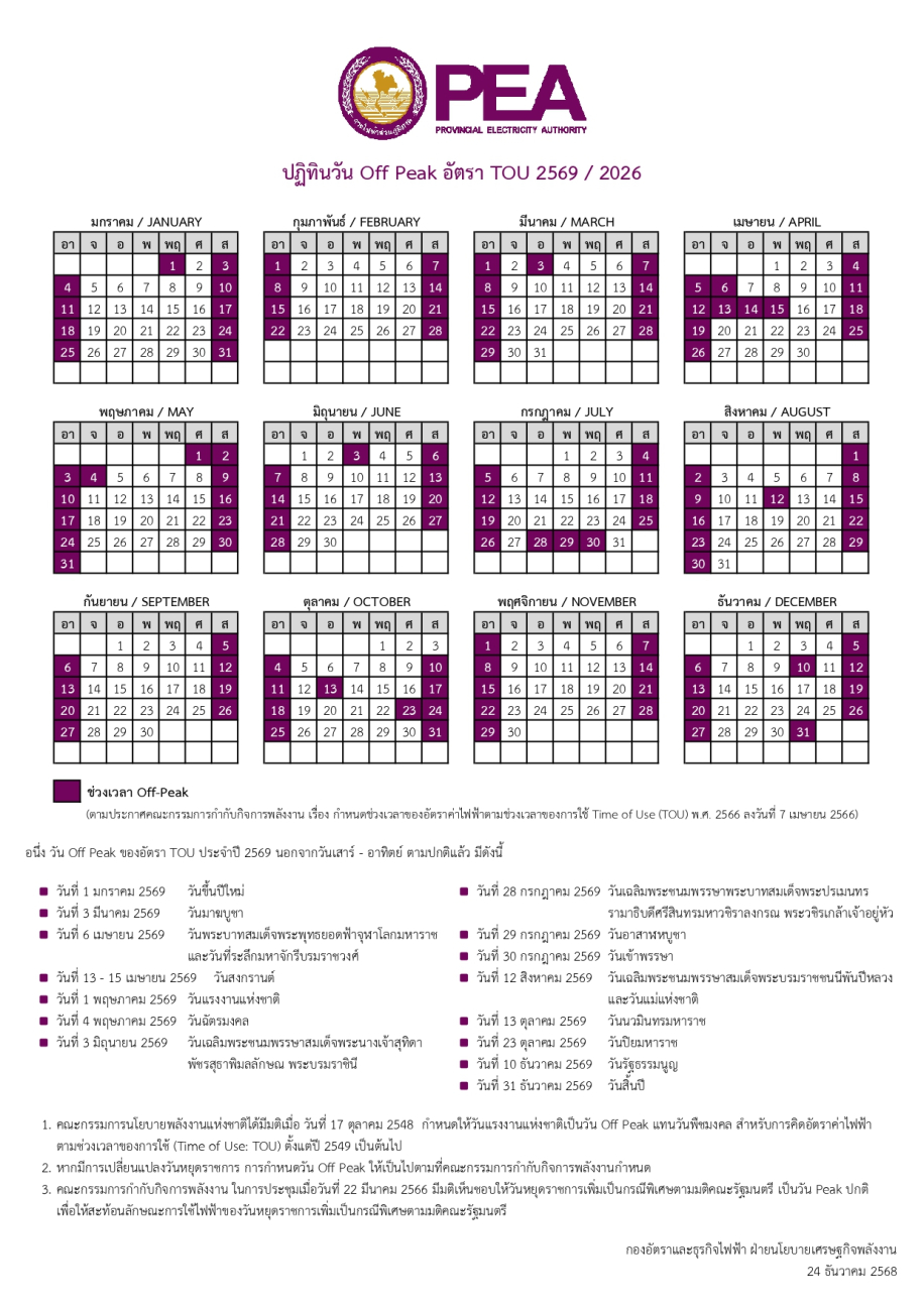 อัปเดตปฏิทิน Off Peak สำหรับมิเตอร์ TOU ประจำปี 2569 (2026) จากการไฟฟ้าส่วนภูมิภาค หรือ PEA  และการไฟฟ้านครหลวง หรือ MEA ซึ่งจะบอกวันหยุดต่าง ๆ ที่สามารถใช้อัตรา TOU ทำให้ค่าไฟประหยัดกว่าช่วง Peak