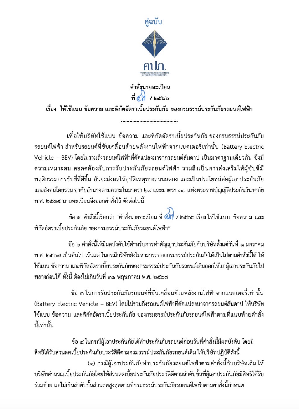 คปภ. อนุมัติ เกณฑ์ประกันรถยนต์ไฟฟ้า (BEV) คุ้มครองแบตเตอรี่ตามการใช้งาน เริ่มใช้ 1 ม.ค. 67