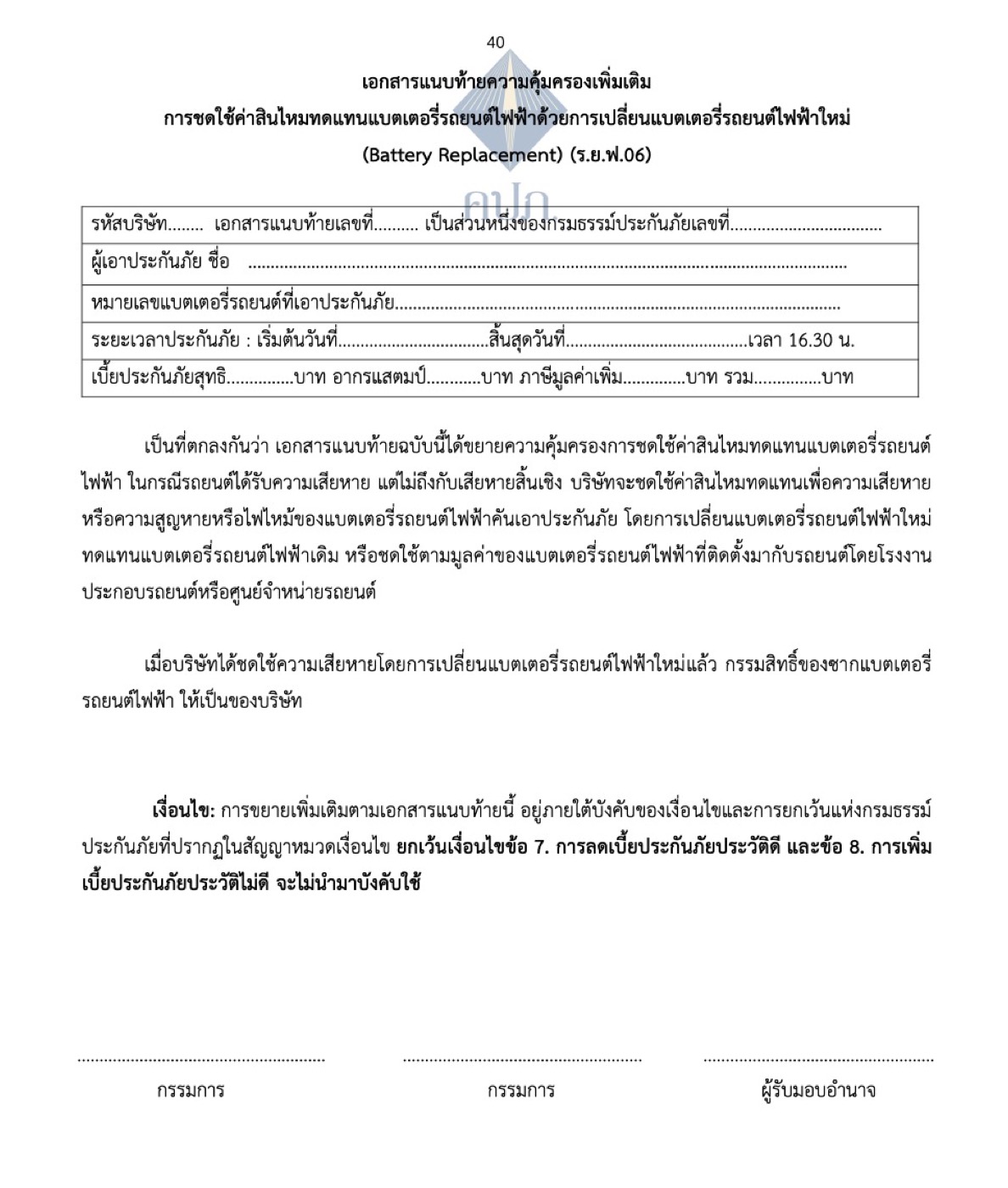 นอกจากนี้ คปภ. ยังได้เพิ่มเอกสารแนบท้ายความคุ้มครองเพิ่มเติมสำหรับรถยนต์ไฟฟ้า (BEV) ให้ผู้ใช้สามารถเลือกซื้อเพิ่มได้ตามความสมัครใจ เช่น การชดใช้ค่าสินไหมทดแทนแบตเตอรี่รถยนต์ไฟฟ้าด้วยการเปลี่ยนแบตเตอรี่ใหม่ กรณีที่ผู้ใช้รถยนต์ไฟฟ้าเกิน 1 ปีต้องการซื้อประกันเพิ่ม เพื่อความอุ่นใจ, การชดใช้ความเสียหายต่อเครื่องชาร์จรถยนต์ไฟฟ้าส่วนบุคคล เมื่อเกิดอุบัติเหตุระหว่างการชาร์จ เป็นต้น
