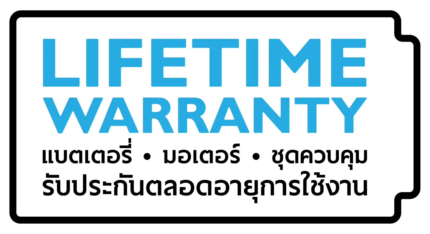 - รับประกันแบตเตอรี่แรงเคลื่อนสูง ชุดมอเตอร์ขับเคลื่อน และชุดควบคุมมอเตอร์ขับเคลื่อน ตลอดอายุการใช้งาน (LIFETIME WARRANTY)