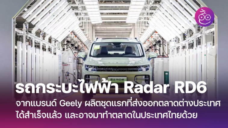รถกระบะไฟฟ้า Radar RD6 จาก Geely ผลิตชุดแรกเพื่อส่งออกไปยังตลาดต่างประเทศ รวมถึงประเทศไทยอาจอยู่ในตลาดต่างประเทศชุดแรกนี้ด้วย แต่ยังไม่ได้รับการยืนยันจาก Geely