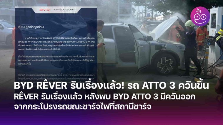 หลังจากที่มีรายงานว่ารถยนต์ BYD ATTO 3 ไฟไหม้ มีควันออกมาจากใต้ฝากระโปรงรถขณะชาร์จในสถานีเมื่อวานนี้ ล่าสุด BYD RÊVER Thailand ก็ได้ออกมาแถลงการณ์ต่อปัญหาที่เกิดขึ้นแล้ว โดยอยู่ระหว่างตรวจสอบหาสาเหตุ