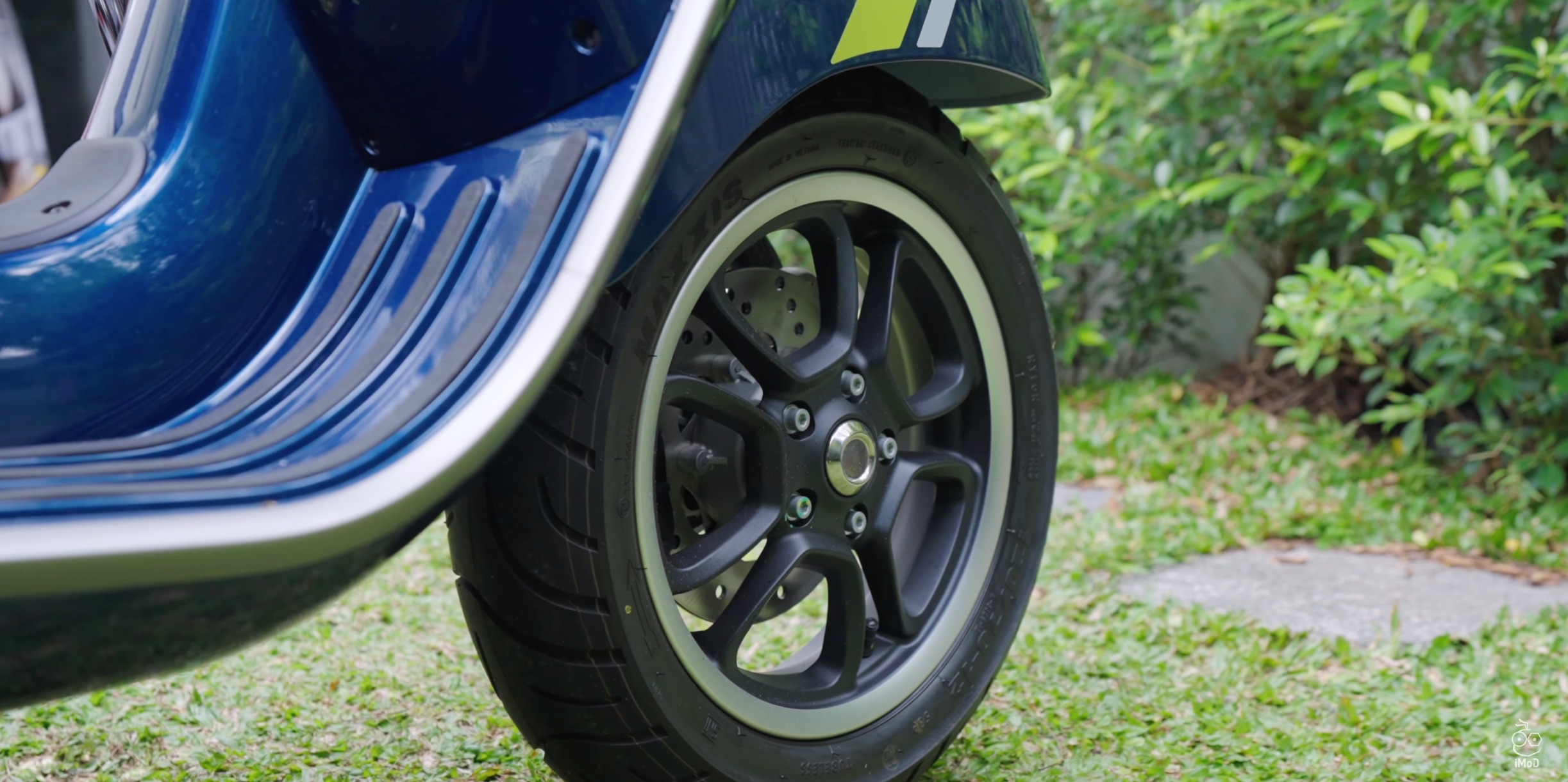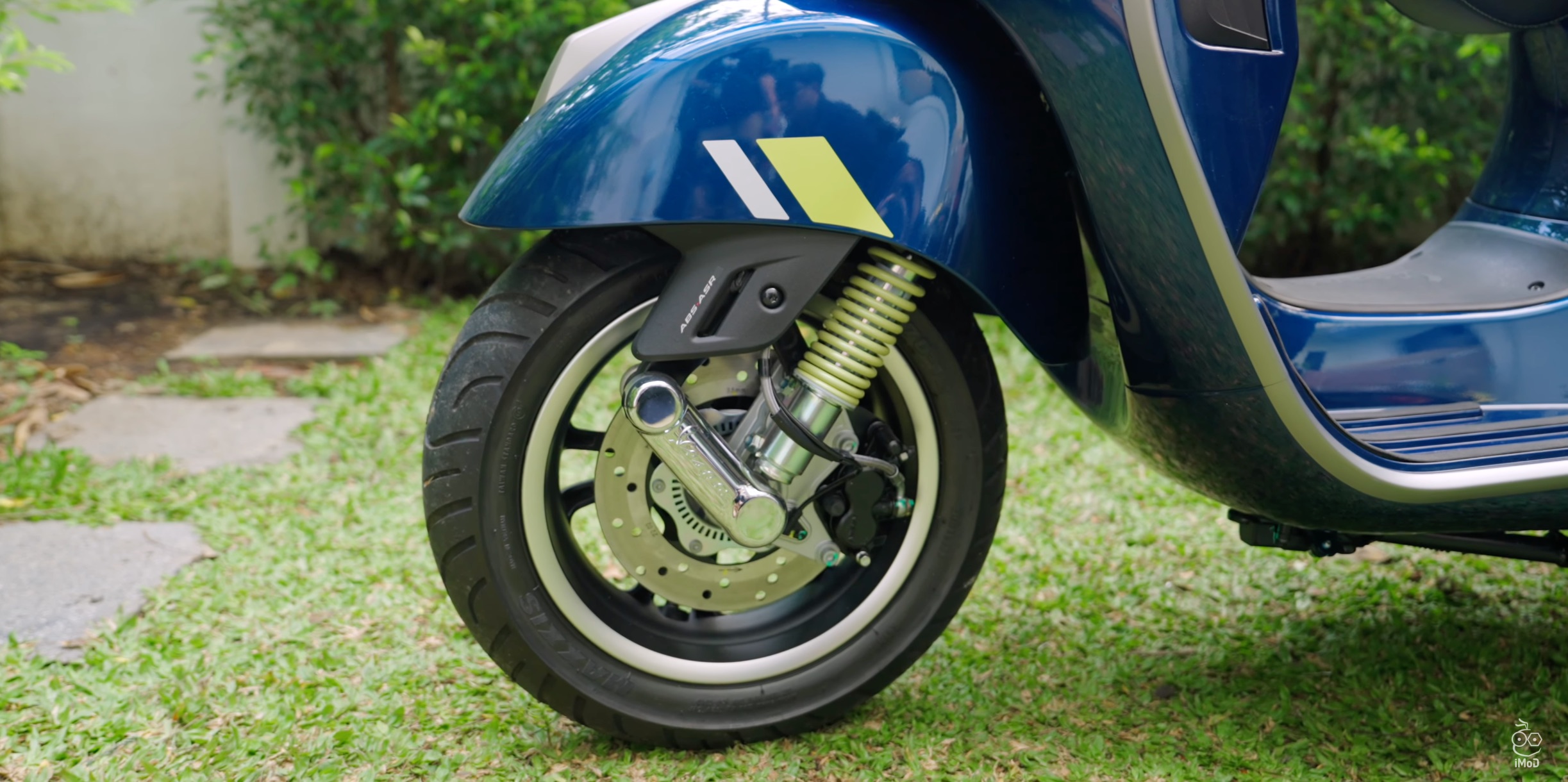 ส่วนของล้อก็มีการปรับแต่งให้มีความสปอร์ตขึ้นมากว่าเดิม ระบบการสั่นสะเทือนยังคงใช้แบบด้านเดียว คงดีไซน์ความเป็นเอกลักษณ์ของทาง Vespa ไว้