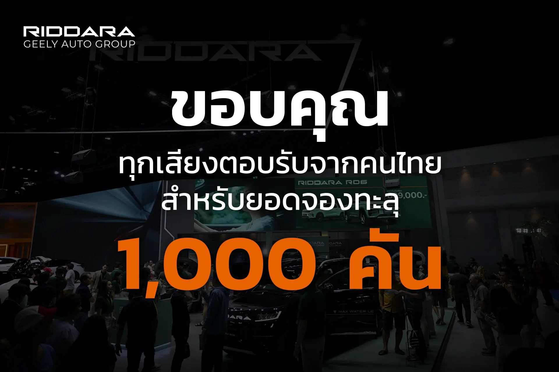 RIDDARA ประเทศไทย ขอบคุณเสียงตอบรับจากชาวไทย ที่ทำให้ RIDDARA RD6 มียอดจองทะลุ 1,000 คัน หลังจากเปิดตัวได้เพียง 2 เดือน และจัดแคมเปญ Final Call RIDDARA EXPO ขยายระยะเวลารับข้อเสนอพิเศษเหมือนจองในงาน Motor Expo สำหรับผู้ที่ร่วมทดลองขับ RIDDARA RD6 ระหว่างวันที่ 16-22 ธ.ค. 2567 นี้เท่านั้น