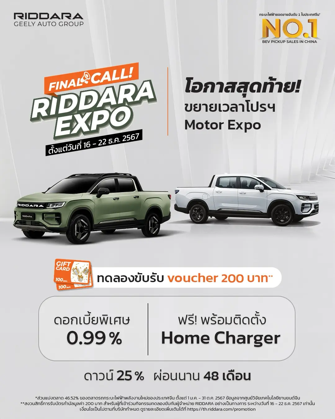“เพื่อตอบแทนเสียงตอบรับที่เกินความคาดหมายจากคนไทย RIDDARA ได้ขยายระยะเวลาข้อเสนอพิเศษสำหรับผู้ที่จอง RIDDARA RD6 ในแคมเปญ Final Call RIDDARA EXPO ระหว่างวันที่ 16-22 ธันวาคม 2567 โดยผู้ที่ร่วมทดลองขับ RIDDARA RD6 ที่โชว์รูม RIDDARA ทั่วไทย รับฟรี! Gift Card มูลค่า 200 บาท พร้อมรับดอกเบี้ยพิเศษ 0.99% ดาวน์ 25% ผ่อน 48 เดือน สามารถลงทะเบียนทดลองขับได้ที่โชว์รูมทุกสาขาทั่วไทย หรือทางเว็บไซต์ https://thailand.riddara.com/th-th/test-drive (*เงื่อนไขเป็นไปตามที่บริษัทฯ กำหนด)”