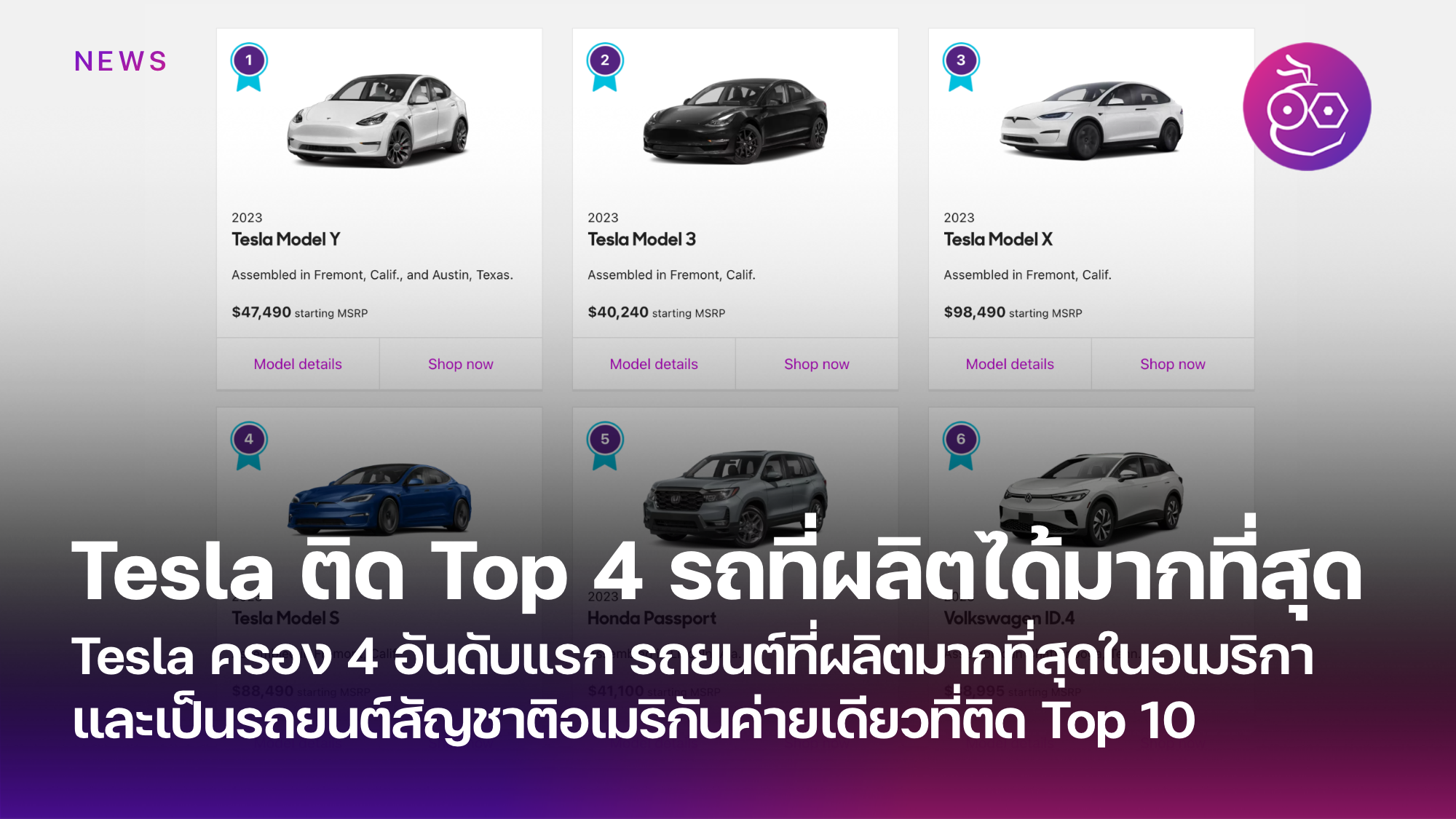 รถยนต์ไฟฟ้า Tesla ครอง 4 อันดับแรก รถยนต์ที่ผลิตมากที่สุดในอเมริกา (รวมรถยนต์ EV และ ICE)