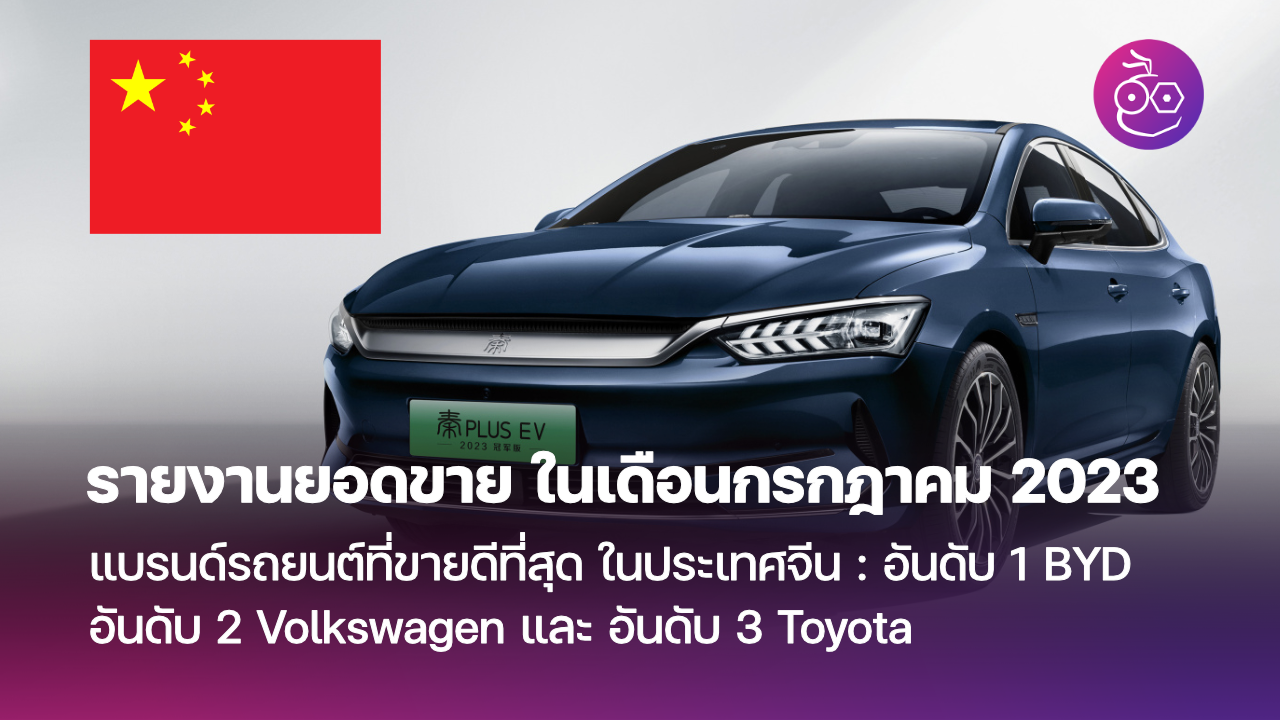 แบรนด์รถยนต์ที่ขายดีที่สุดในเดือนกรกฎาคม 2023 ในประเทศจีน : อันดับ 1 BYD, อันดับ 2 Volkswagen และอันดับ 3 Toyota