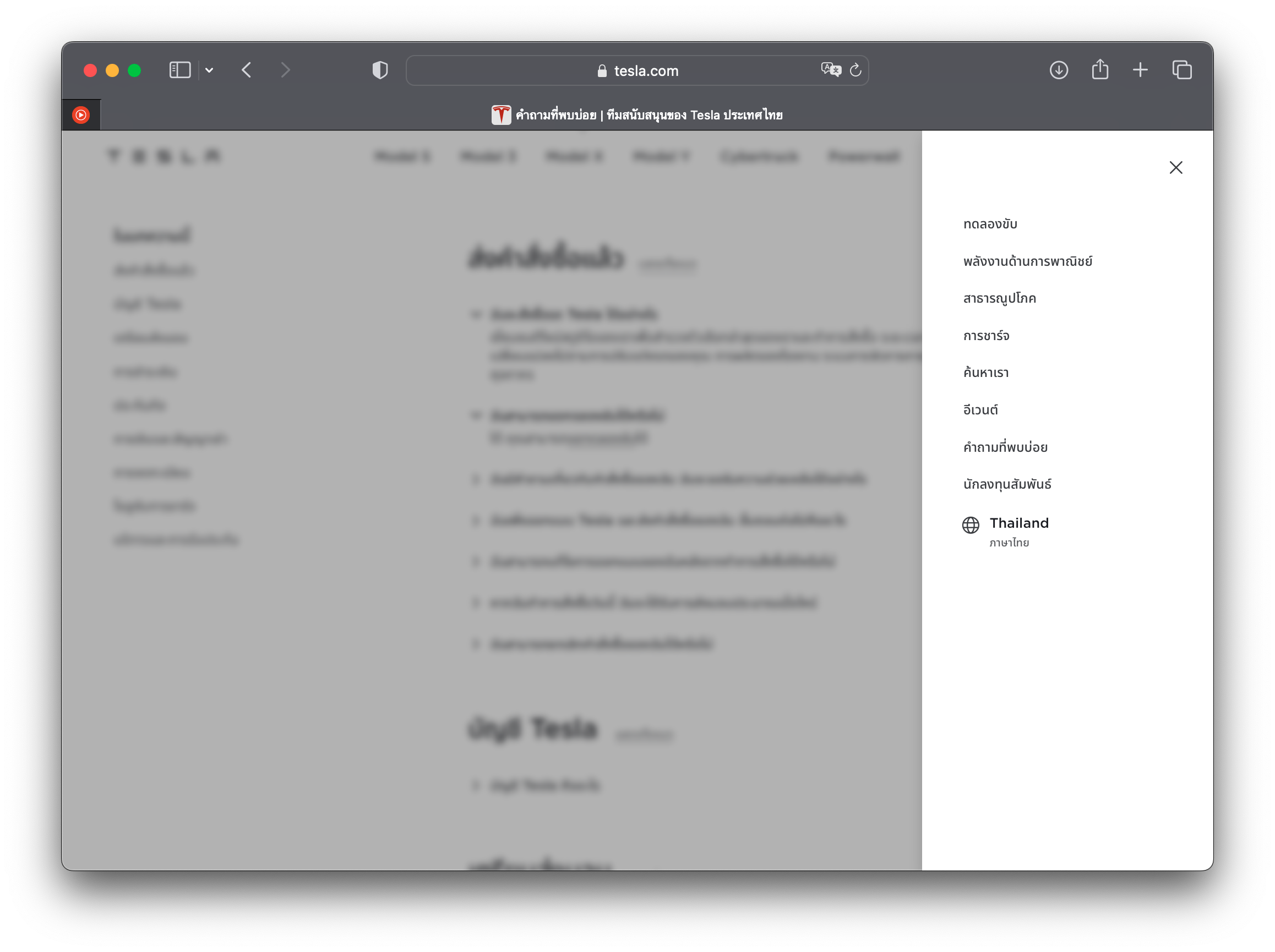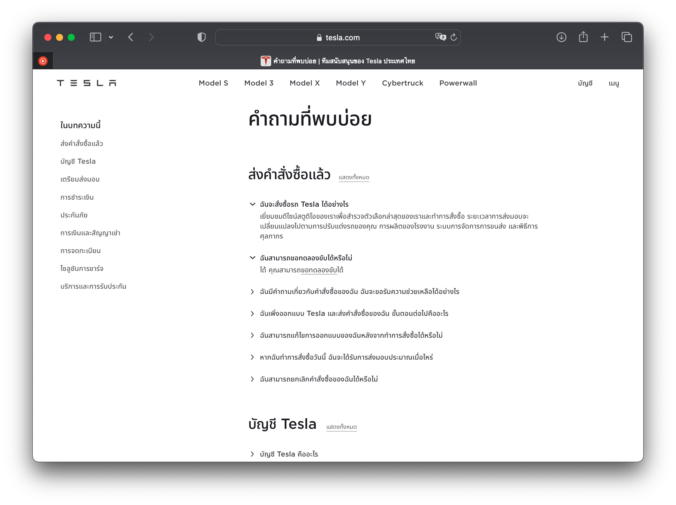 Tesla ขึ้นหน้าเว็บภาษาไทยมากขึ้น คำถามที่พบบ่อย การสั่งซื้อ การจ่ายเงิน และอื่น ๆ