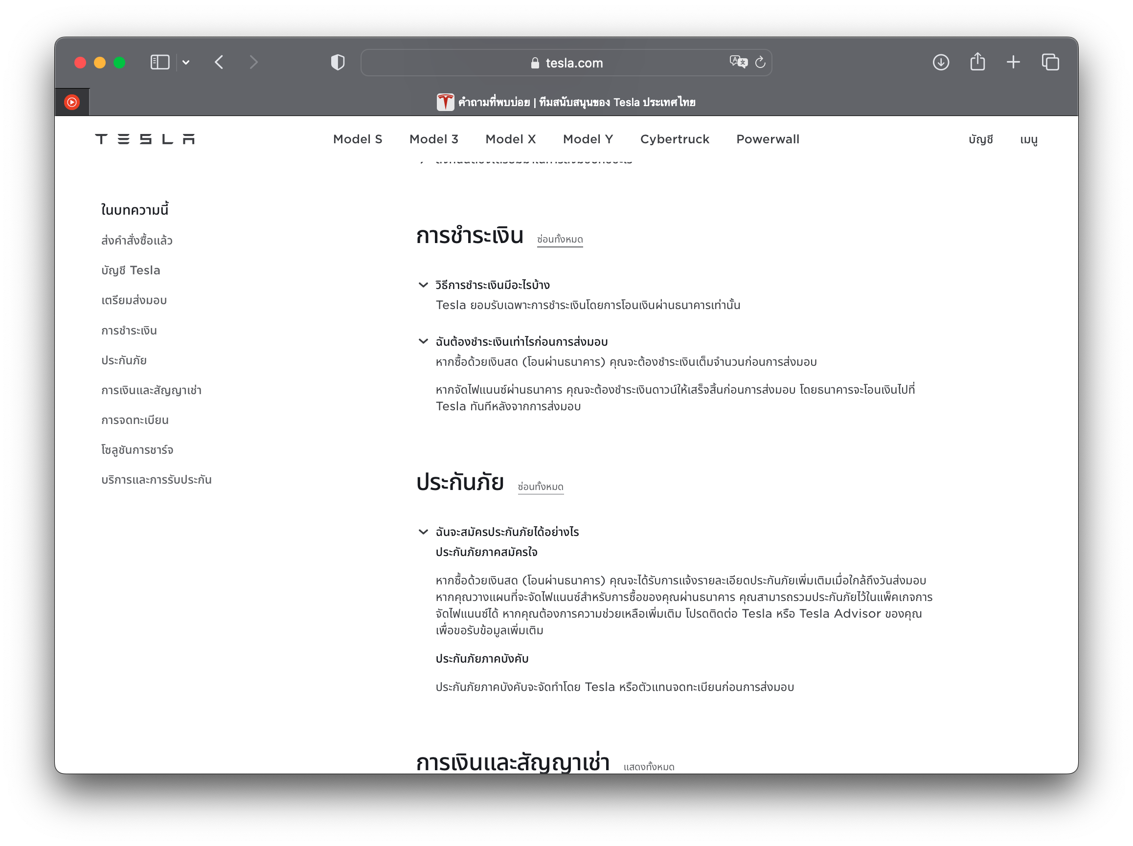 Tesla ขึ้นหน้าเว็บภาษาไทยมากขึ้น คำถามที่พบบ่อย การสั่งซื้อ การจ่ายเงิน และอื่น ๆ
