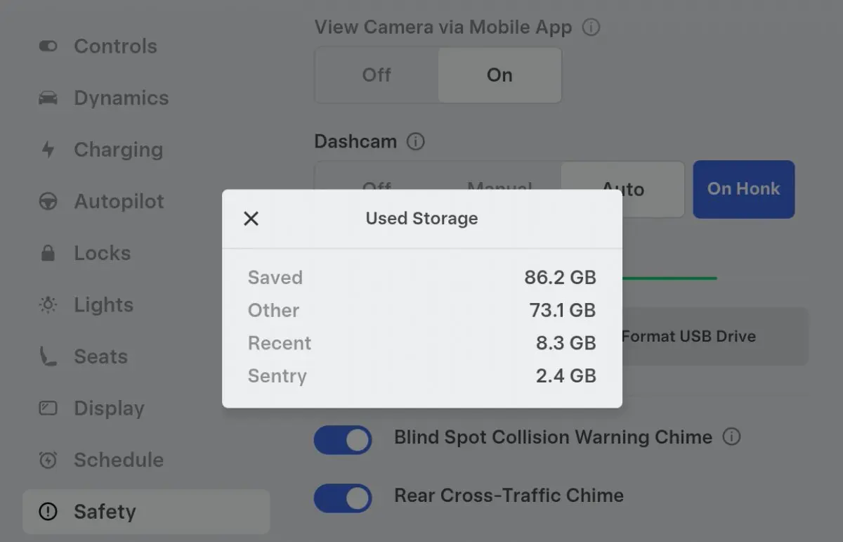 นอกจากนี้ หากกดที่ไอคอนตัว (i) เราจะเห็นรายละเอียดว่าฟีเจอร์ไหนใช้พื้นที่ไปเท่าไหร่ เช่น วิดีโอ Dashcam, Sentry Mode หรือไฟล์เพลง